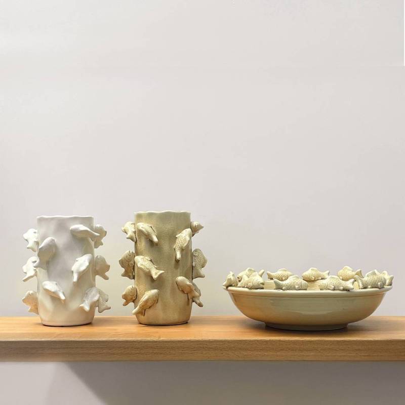 Centre de table en céramique bleu, orné de petits poisson tout autour. Idéale en centre de table pour une touche originale, elle peut accueillir des fruits ou simplement servir d’objet déco.