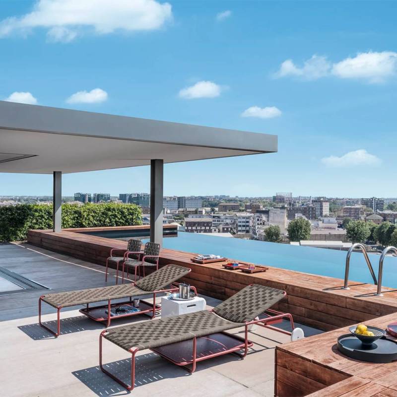 Le transat Inout 883 présente une structure inclinable en tube d’aluminium laqué gaufré peint en Pearl, Oxido, Agate ou Slate, avec deux roues en téflon qui facilitent son déplacement. La structure combine en outre fonctionnalité et esthétique grâce à un plateau porte-objets placé sous l’assise, qui est formée d’un tressage en sangle élastique bleue, noire, tabac ou grise.