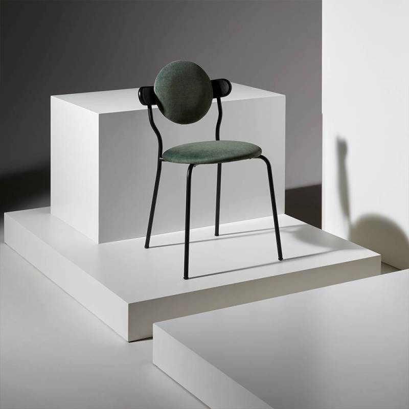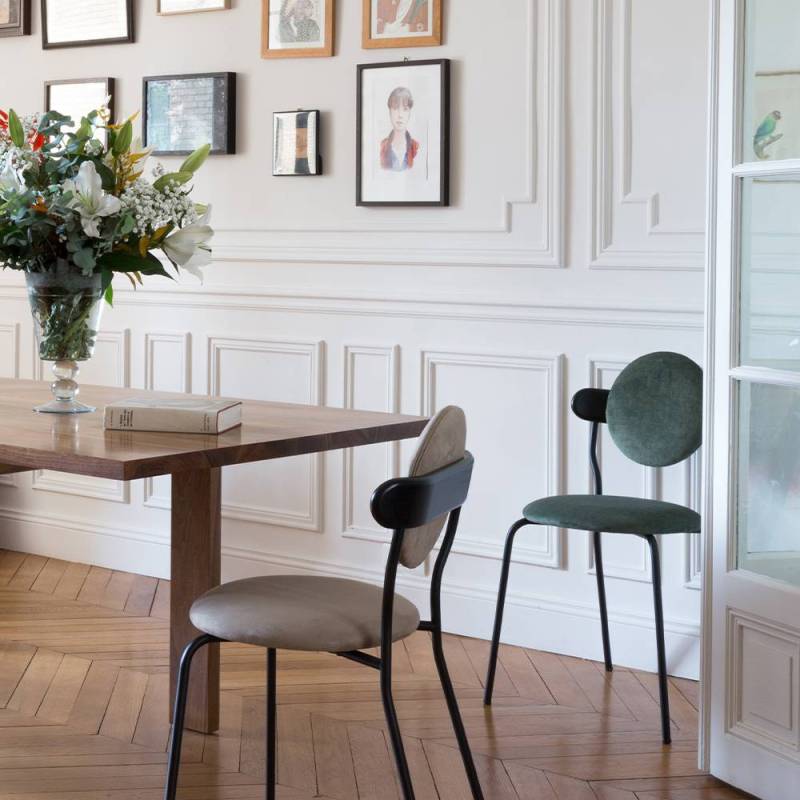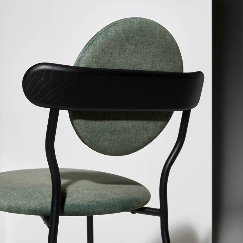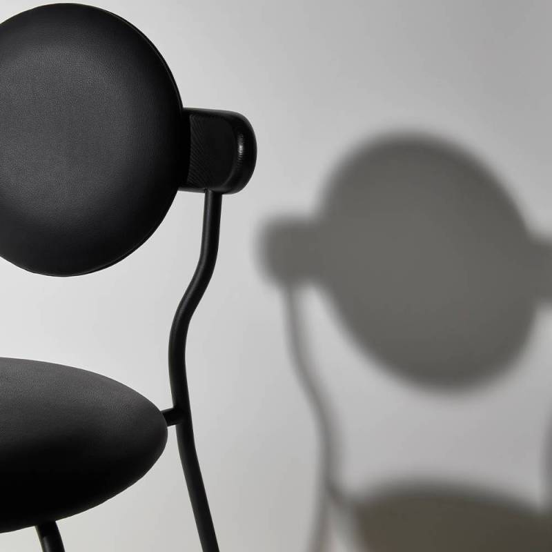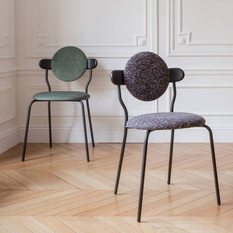 Les anneaux de la 6ème planète du système solaire sont principalement composés de particules de glace et forment une ellipse lisse qui a inspiré la forme du dossier en bois supportant le coussin rond de Planet.La texture subtile du bois massif associée au toucher délicat d'une toile de laine de la Maison Pierre Frey donne à la Planète une sensation de douceur et de luxe. La chaise Planet combine la poésie des corps célestes avec la froide technicité des modules spatiaux, la structure métallique noire mate apportant une sensation technique contrastée.