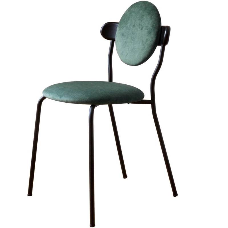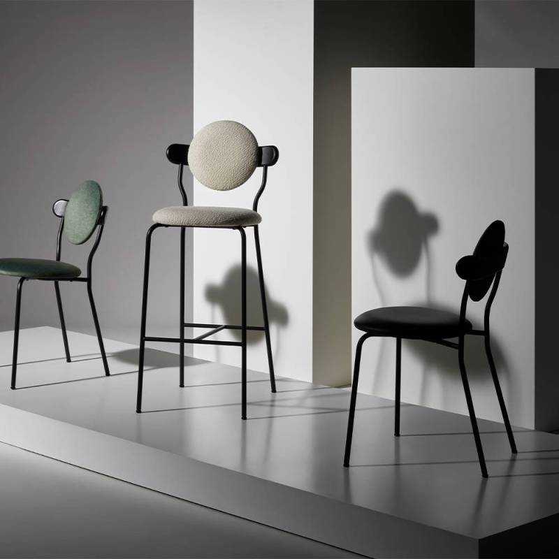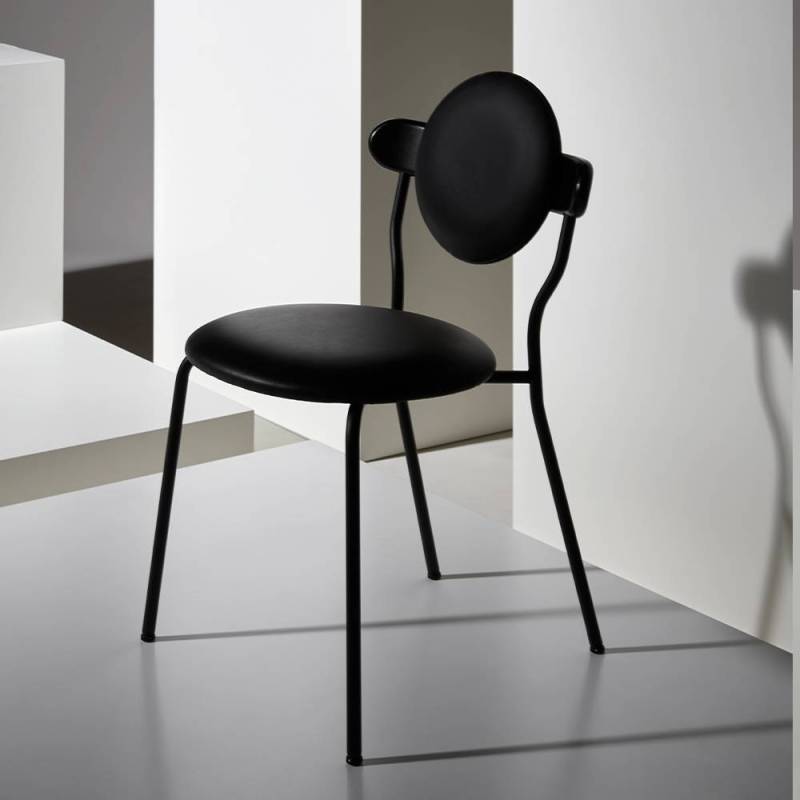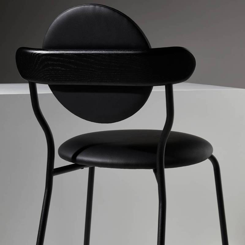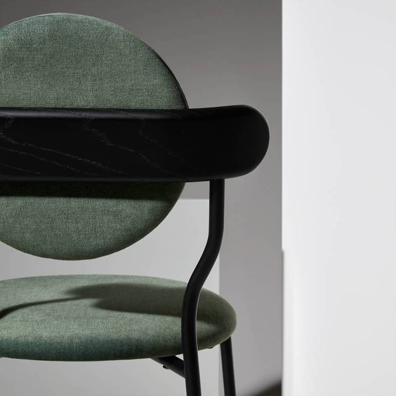 Les anneaux de la 6ème planète du système solaire sont principalement composés de particules de glace et forment une ellipse lisse qui a inspiré la forme du dossier en bois supportant le coussin rond de Planet.La texture subtile du bois massif associée au toucher délicat d'une toile de laine de la Maison Pierre Frey donne à la Planète une sensation de douceur et de luxe. La chaise Planet combine la poésie des corps célestes avec la froide technicité des modules spatiaux, la structure métallique noire mate apportant une sensation technique contrastée.