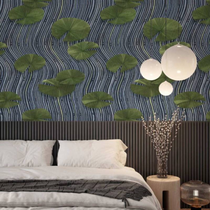 Le papier peint végétal Along the River vert, bleu foncé, blanc, peint à la main par Lucille Boitelle, évoque le calme d’une rivière stylisée aux courbes ondoyantes, où flottent paisiblement des nénuphars pour une décoration murale apaisante et poétique.