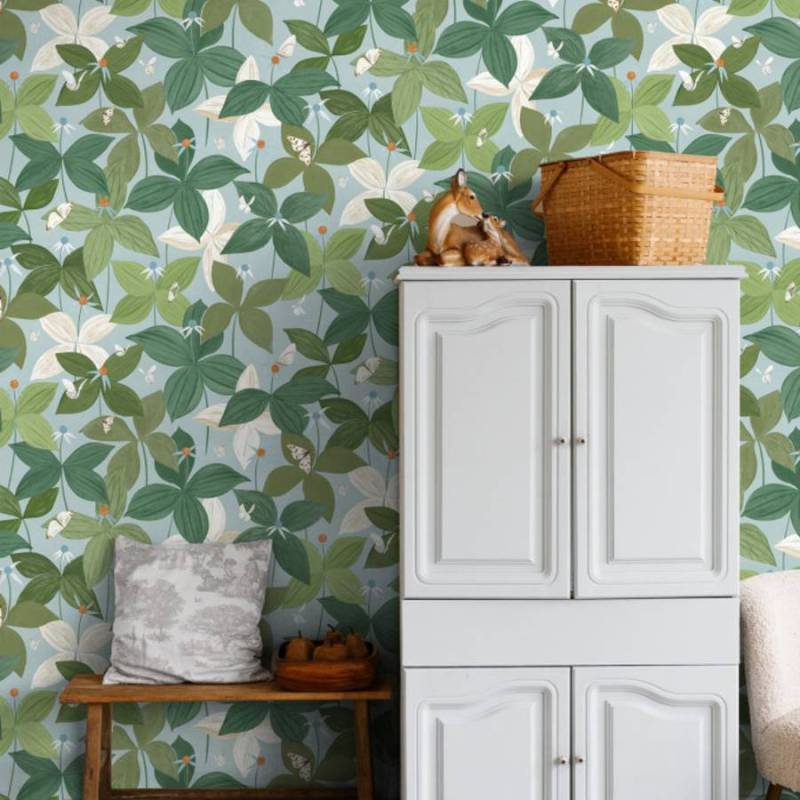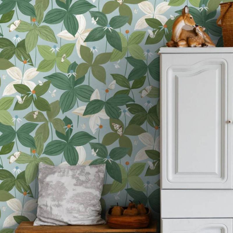 Le papier peint Among Butterflies nous plonge au cœur de la forêt, dans la douceur ombragée des sous-bois où s’épanouissent les parisettes. Avec leurs quatre feuilles caractéristiques et leur fruit central, ces plantes champêtres évoquent de grandes fleurs délicates, empreintes de charme bucolique. De petits papillons – à l’origine blancs – virevoltent paisiblement au-dessus de ce tapis végétal, butinant d’une plante à l’autre. Entièrement peint à l’acrylique par le studio de design, ce motif riche et raffiné célèbre la nature dans toute sa poésie. Dans sa version originale, Among Butterflies se pare d’un fond bleu nuit et de plantes au bleu incandescent, lui conférant une aura mystique. Il se décline également en camaïeu de verts pour une ambiance contemporaine et naturelle, ou sur fond clair pour une touche de légèreté.
