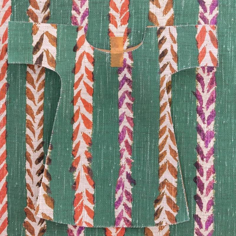 Les chevrons rouges et pourpres, légèrement irréguliers, rappellent des empreintes de feuilles ou de plumes stylisées. Ce motif incarne la simplicité apparente et la richesse de son trait. Le trait naturel est le prolongement de la main d’Isabelle ; il est comme une évidence pour elle. Il est toujours vivant, tracé au pinceau, et il nous permet de ressentir la spontanéité du geste, son élan ; parfois il est silence, et parfois il est motif… L’impression sur une toile textile en lin rappelle de manière authentique le trait de l’artiste.
