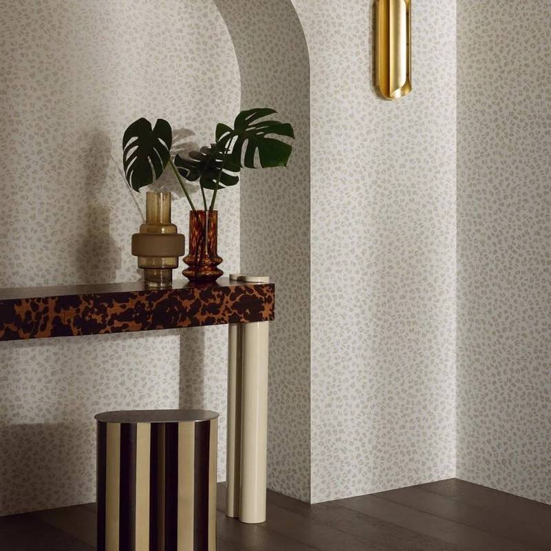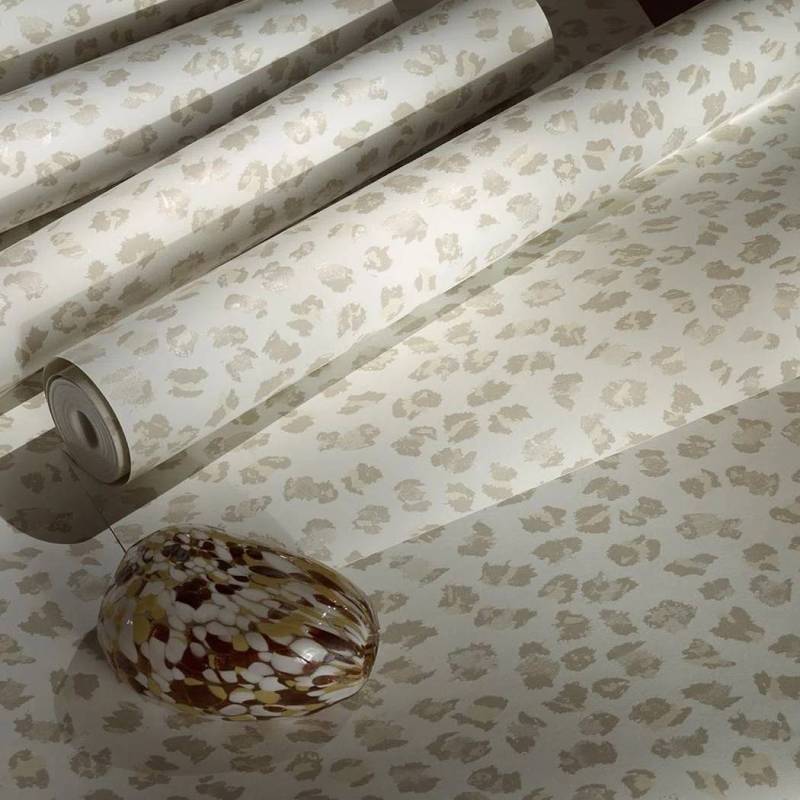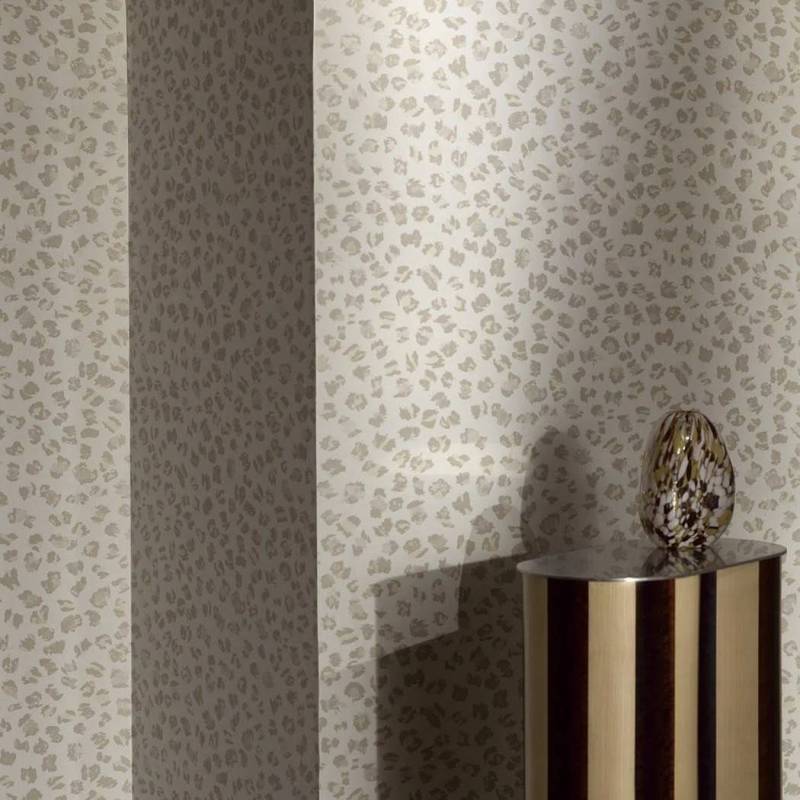Entre tachisme contemporain et panthère sauvage, le mur se pare d'un motif d'inspiration « animal » dans des coloris audacieux imprimés de façon traditionnelle au rouleau. Les reflets métallisés des encres apportent sophistication et élégance.