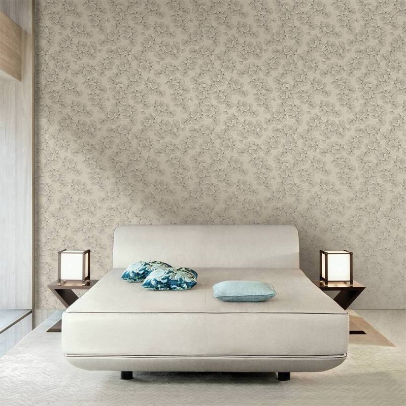 De grandes feuilles de ginkgo à l’échelle macro caractérisent ce revêtement mural, baptisé du nom de la ville millénaire de Dali en Chine. Les feuilles semblent dessinées de traits délicats sur un fond tridimensionnel marqué par un effet de soie shantung, avec ses nœuds et irrégularités caractéristiques. La beauté intemporelle du ginkgo — symbole de longévité et de régénération — fait écho aux valeurs d’Armani et à son goût pour les influences orientales.