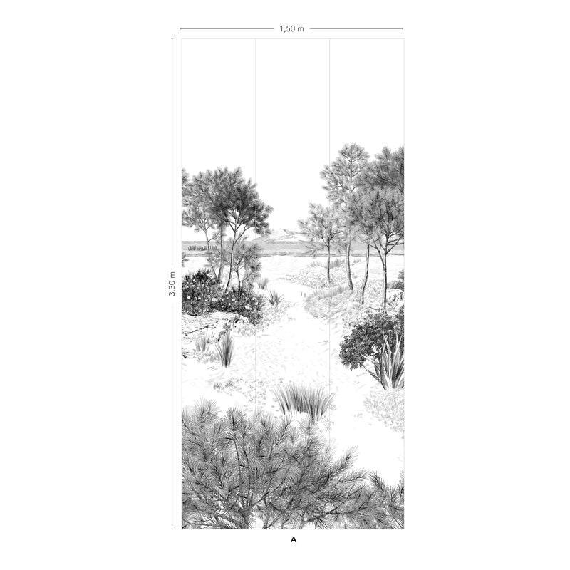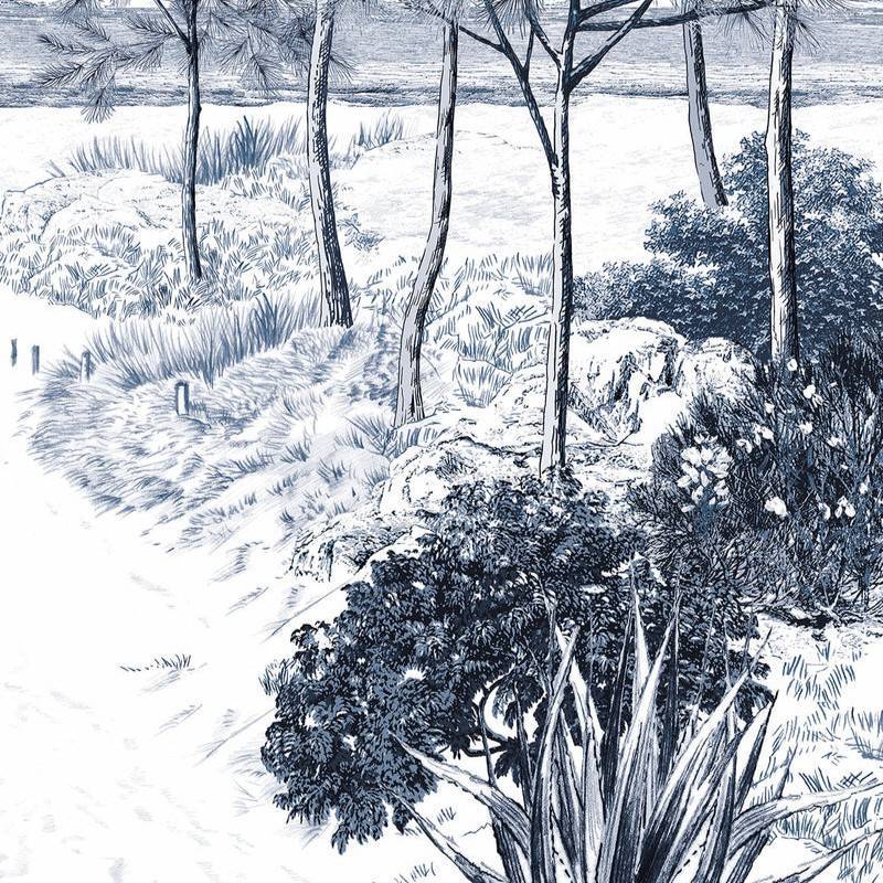 Ce papier peint panoramique est inspiré des paysages marins et des dunes de sable des côtes Atlantique. L'océan s’ouvre derrière la forêt de pins qui borde la côte.