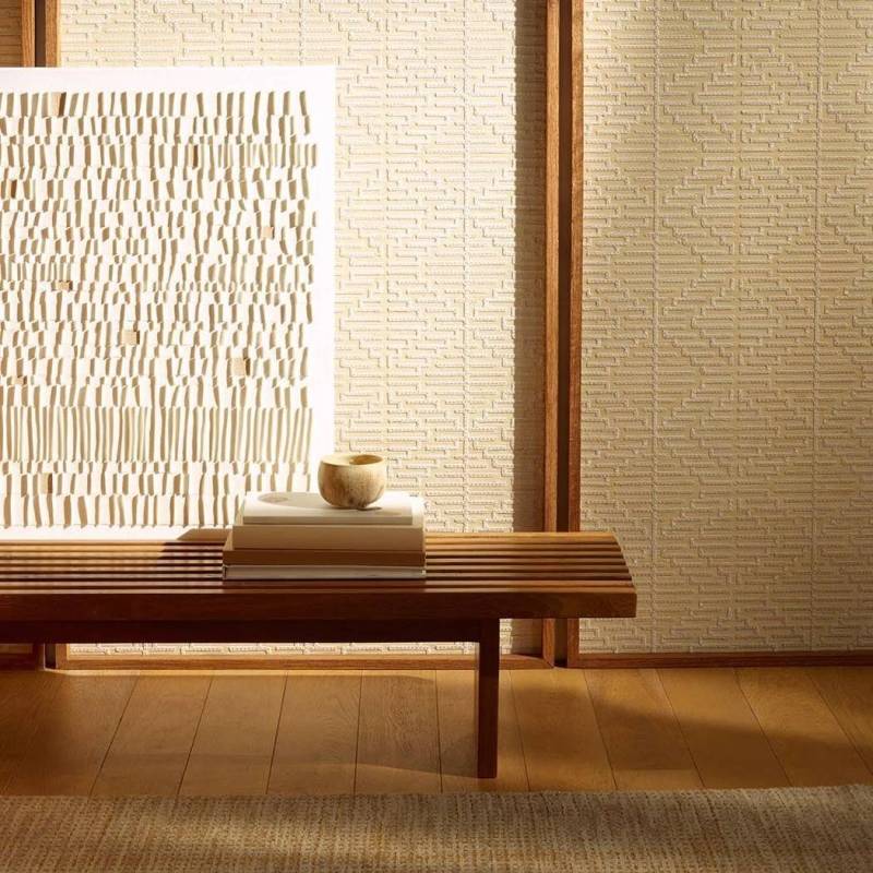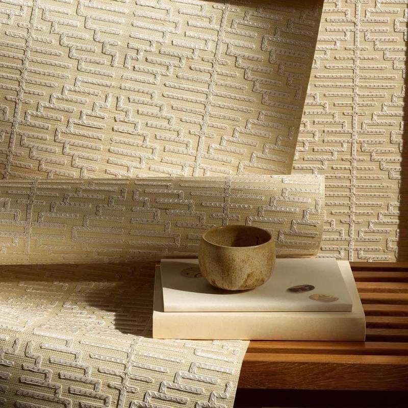 Magnifique broderie géométrique nacrée sur un fond en sisal contrecollé sur intissé. Tel un bijou, elle confère au mur une allure d’exception.