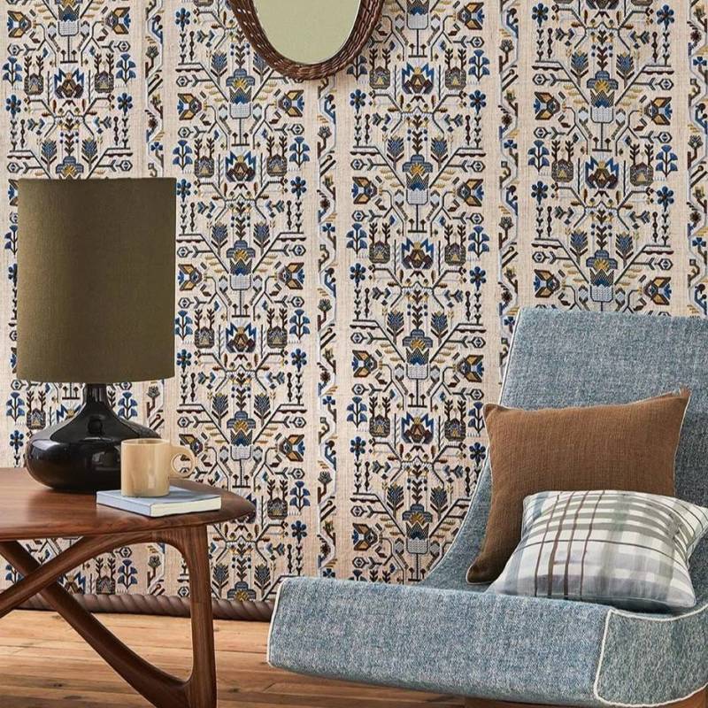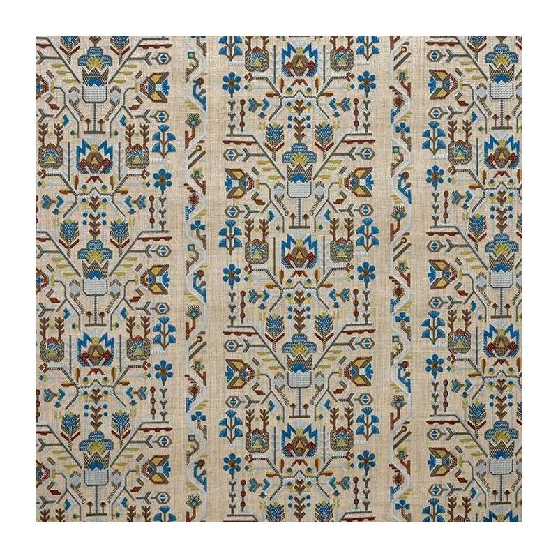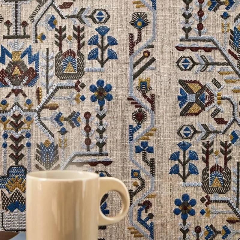 Inspiré des boiseries scandinaves peintes, ce motif, construit sous forme de larges bordures, est brodé sur un support contenant majoritairement de la soie.
