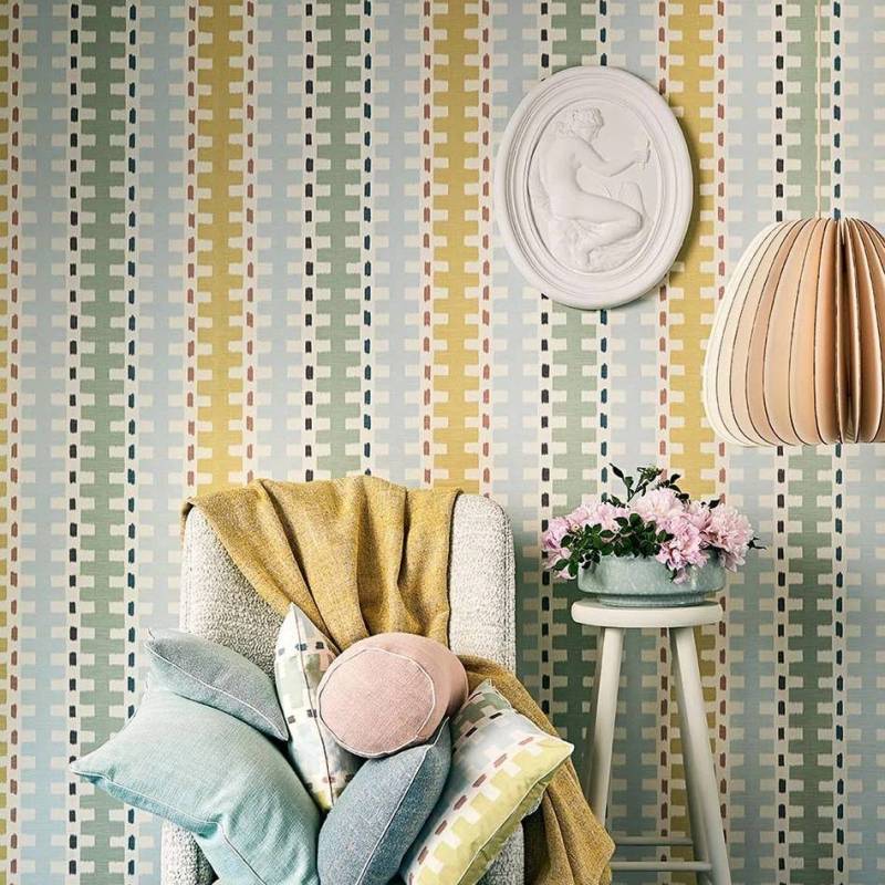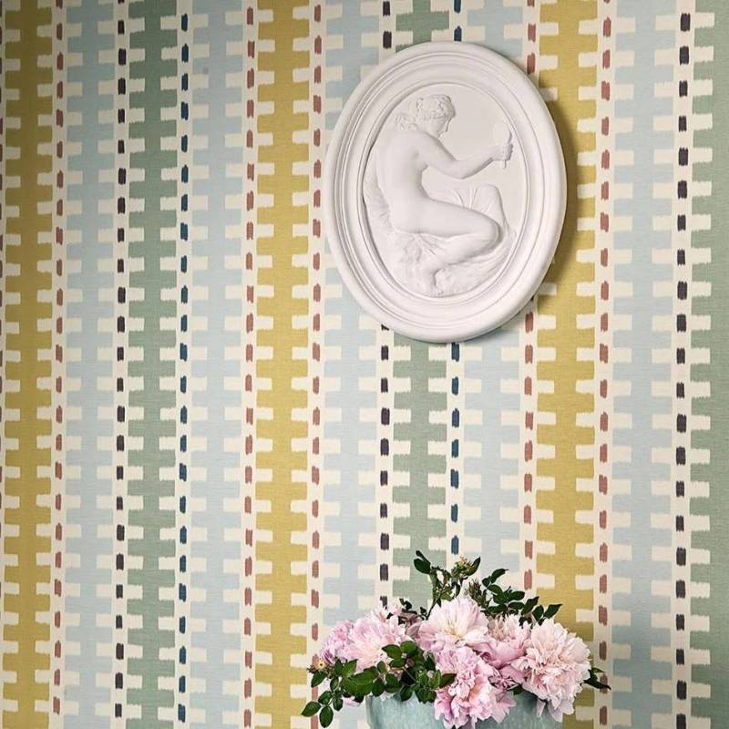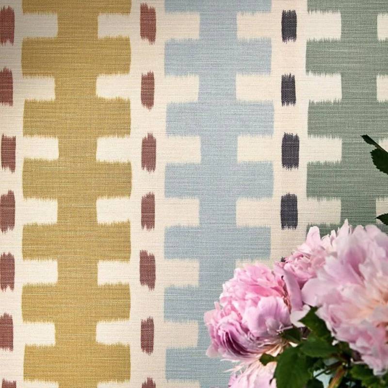 Somptueux imprimé chaîne au motif géométrique coloré et joyeux, contrecollé pour s’adapter au mural. Gustaf se coordonne parfaitement au tissu du même nom.