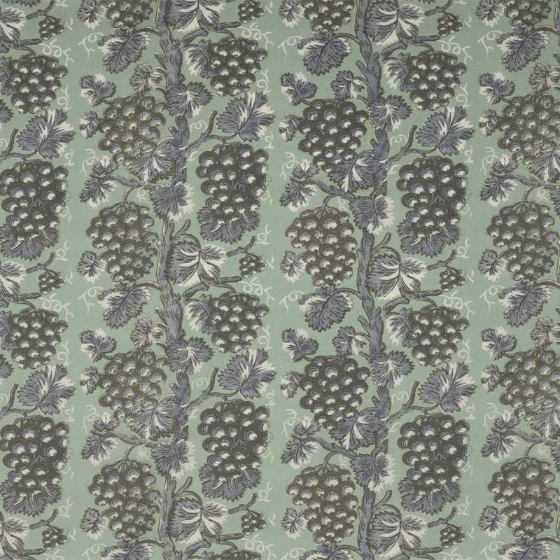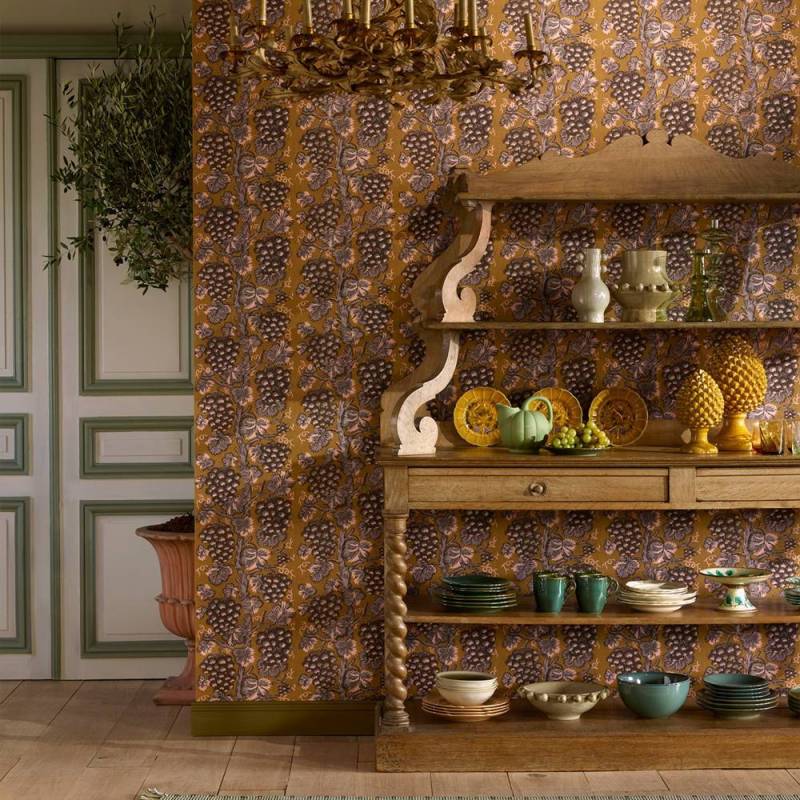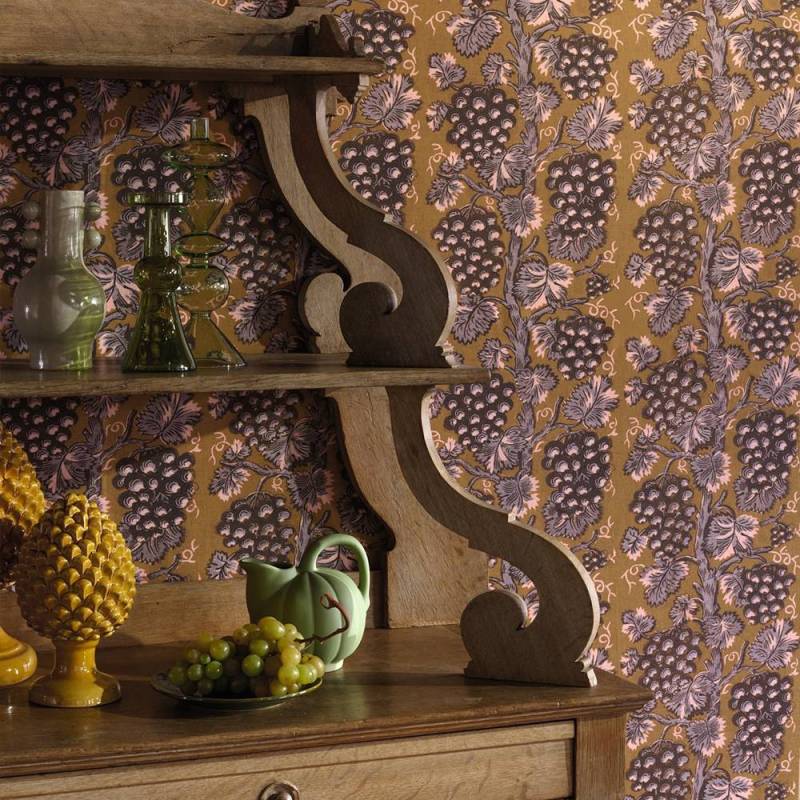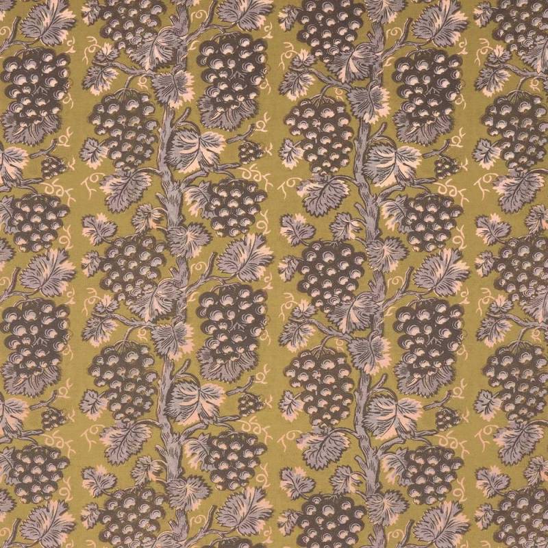 Harcourt réinterprète une toile imprimée à la planche de bois de la seconde moitié du XVIII? siècle, conservée dans les archives de la Maison. Célébrant les bontés de la nature dans un esprit rousseauiste, son motif de grappes de raisins en rayure et l’impression sur lin contrecollée sur intissé possèdent le charme des références historiques ainsi que la sincérité des dessins dont l’équilibre parfait tient à l’imperfection de la main.