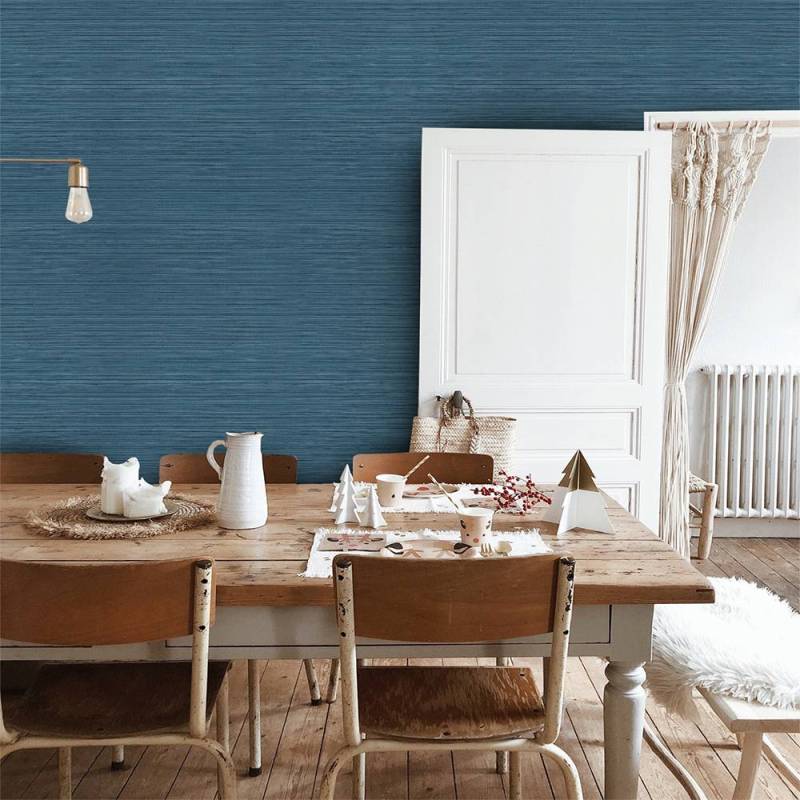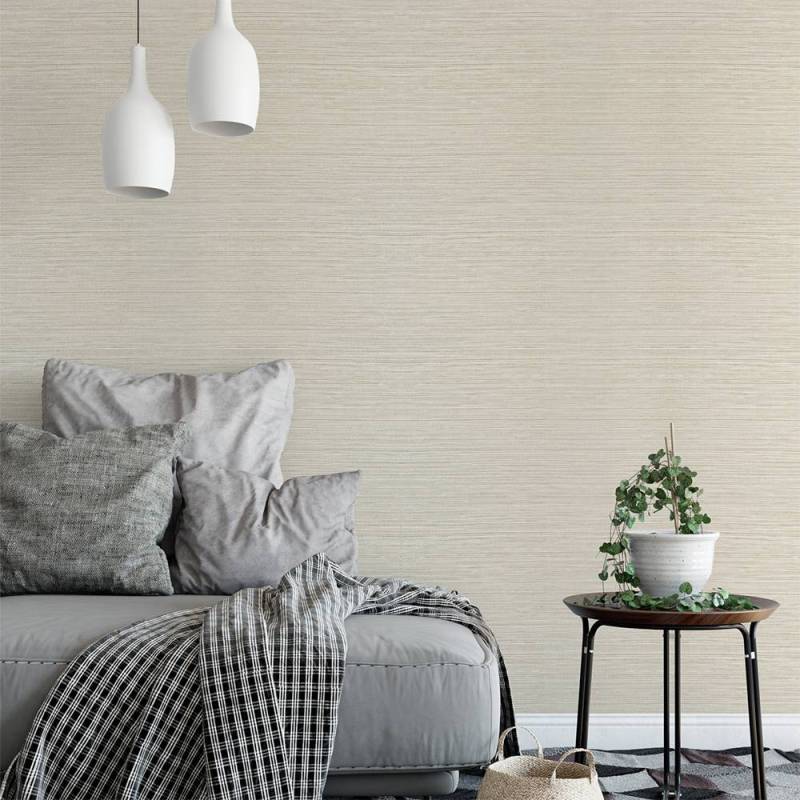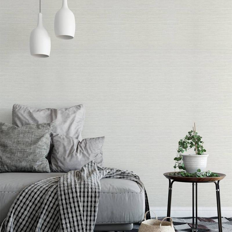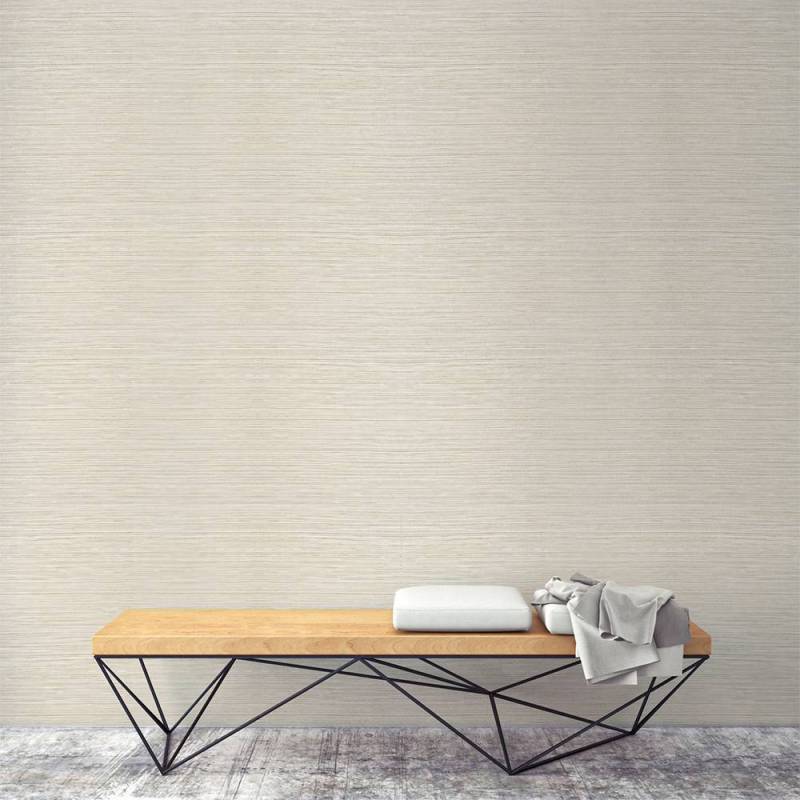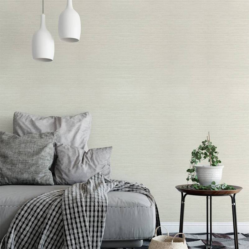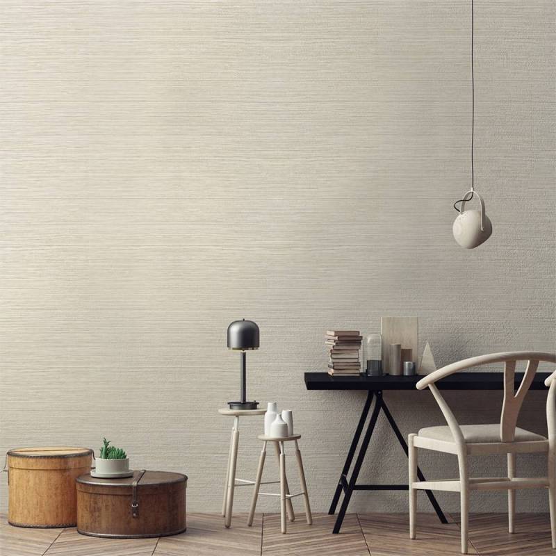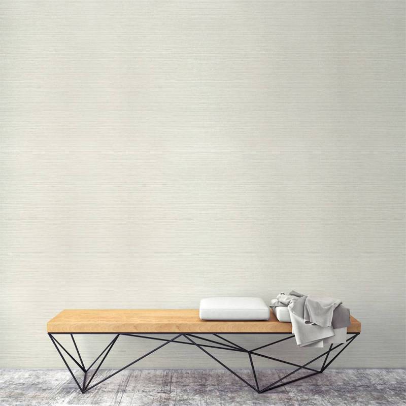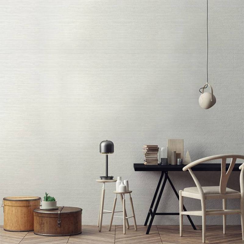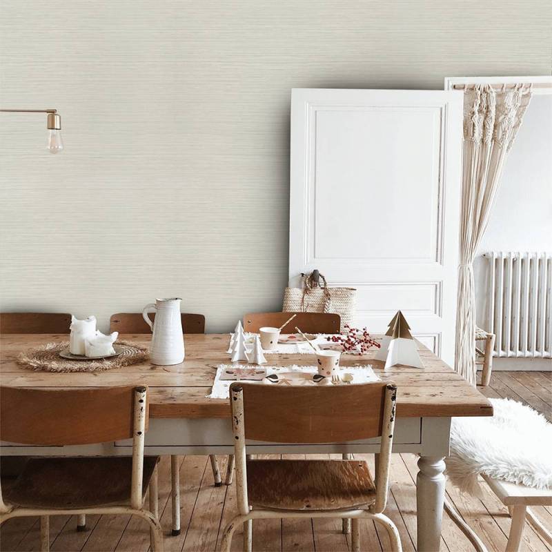Le papier peint Kendari Grass fait partie de la collection Texture Resource 6 de Thibaut. Ce papier peint vinyle de type II reproduit l'effet de la toile de ramie, ici dans un coloris très doux et lumineux, entre le blanc cassé et le crème. Il se décline dans 12 coloris.
