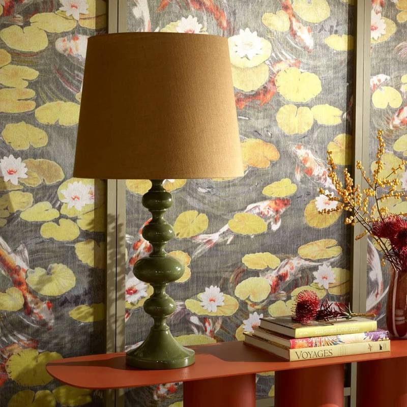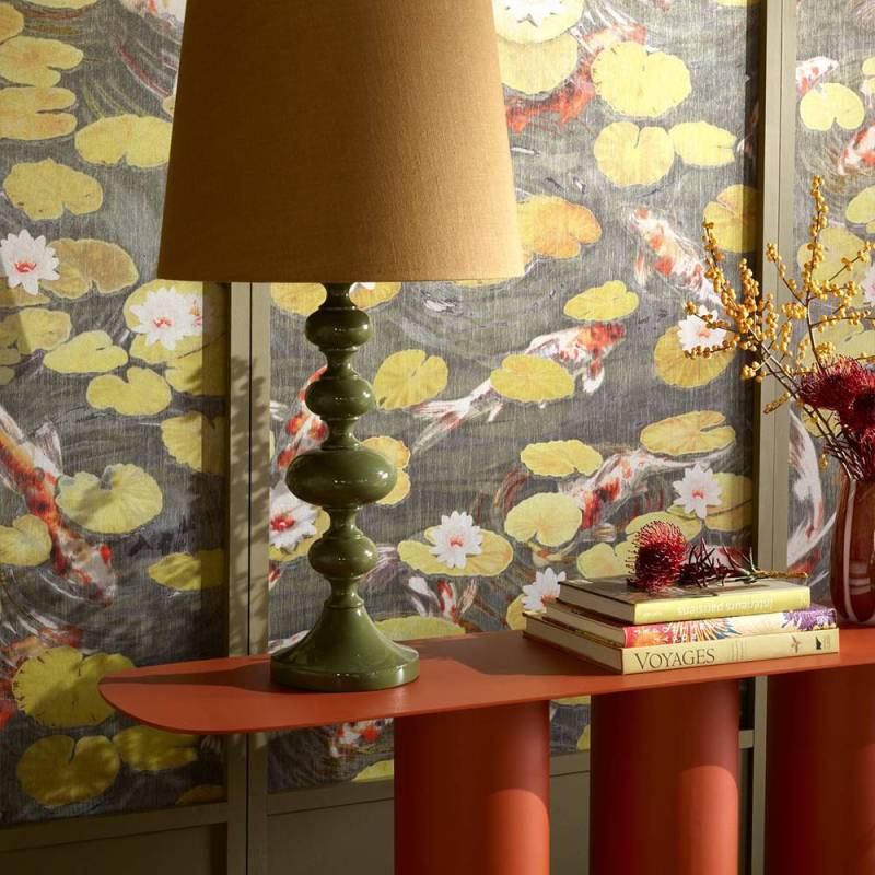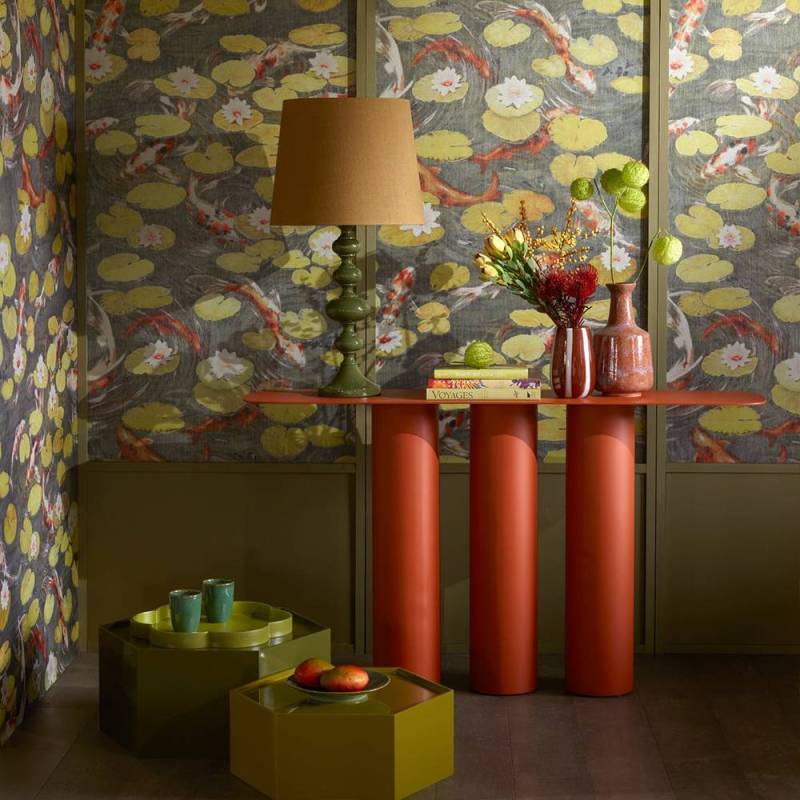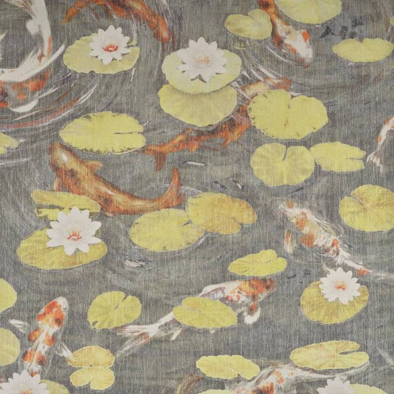 Évocation contemporaine des bassins des jardins de châteaux, où carpes et nénuphars rythment les eaux. Il est imprimé de manière innovante sur un intissé fibreux ajouré, contrecollé sur un foil argenté, rappelant avec élégance le miroitement de l’eau.