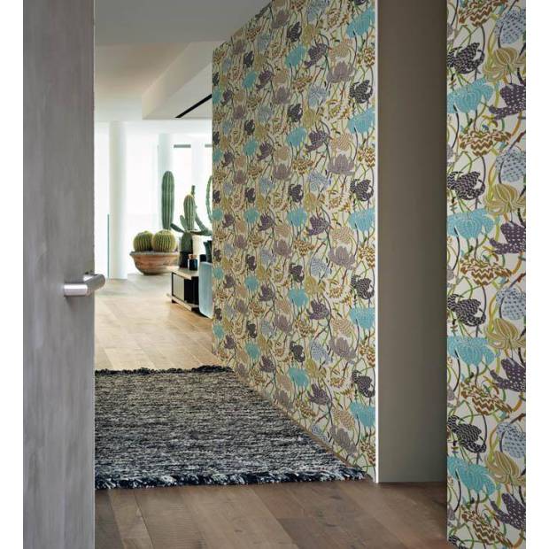 Une véritable encyclopédie Missoni, réinterprétant le lys de manière illustrative : les lignes stylisées des fleurs renferment des motifs décoratifs classiques avec des lignes brisées, appliquées à plat sur les pétales, tandis qu'une nature irrévérencieuse ressort des couleurs de fond denses et contrastées, proposées en rouge, bleu, et sur des tons beiges et blancs.