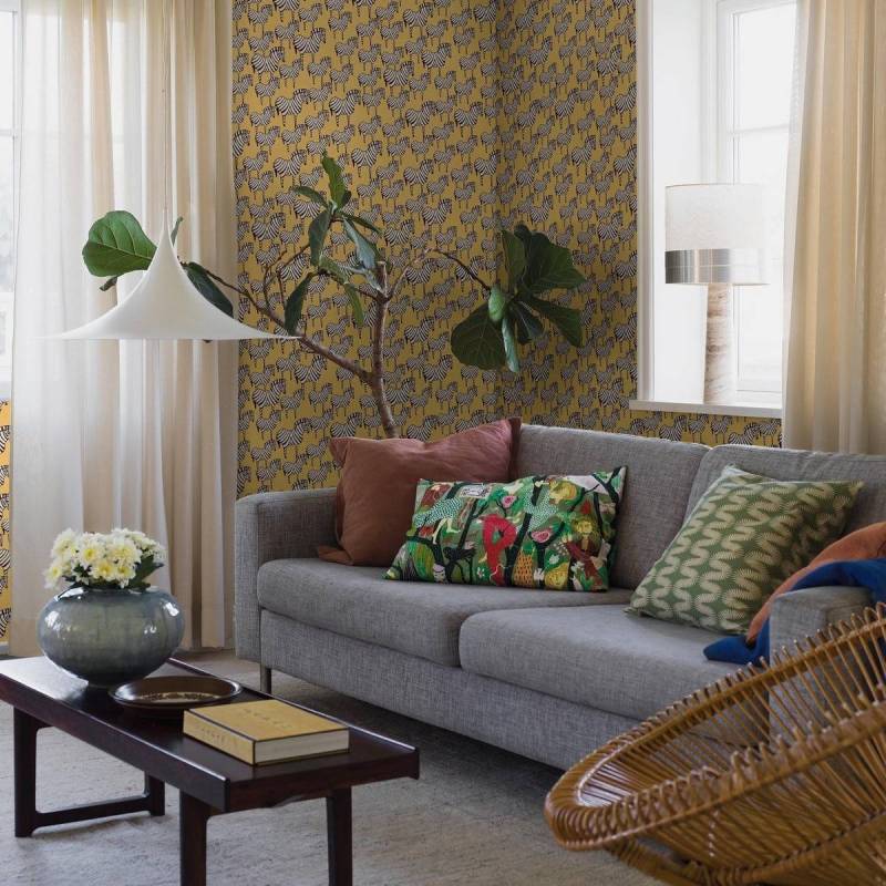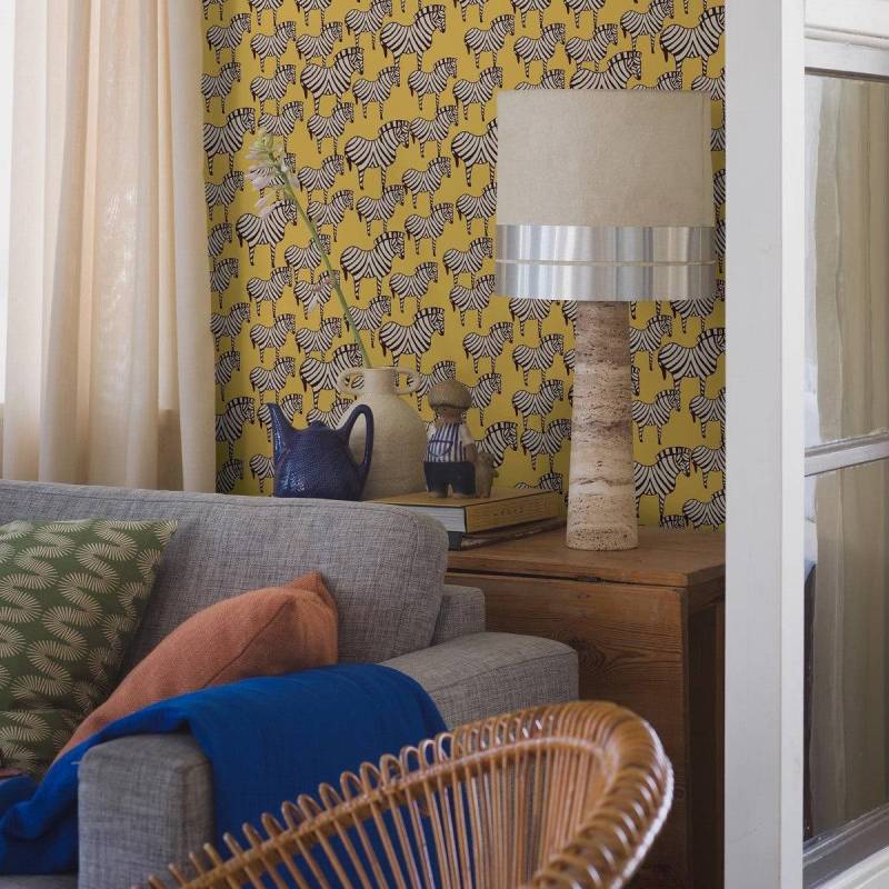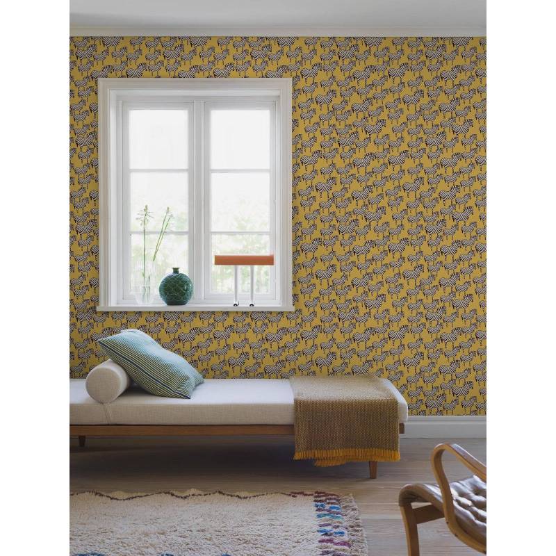 Le zèbre en céramique de 1957, œuvre emblématique de Lisa Larson, reprend vie dans ce remarquable papier peint Zebra. Proposé en plusieurs variantes de couleur, le motif graphique est ici imprimé en noir et blanc sur un fond jaune savane atténué, créant un dessin audacieux et rythmé.