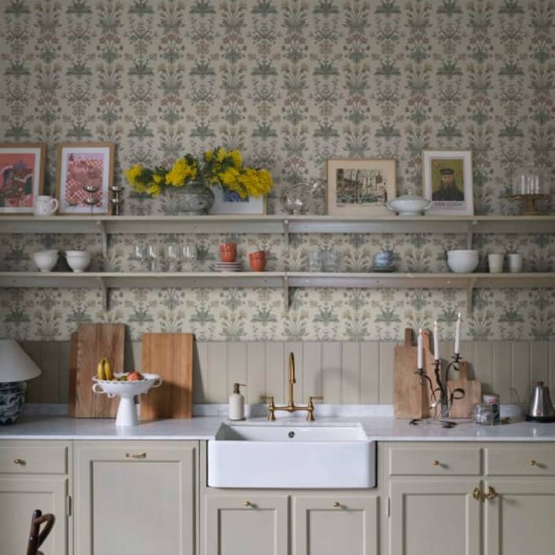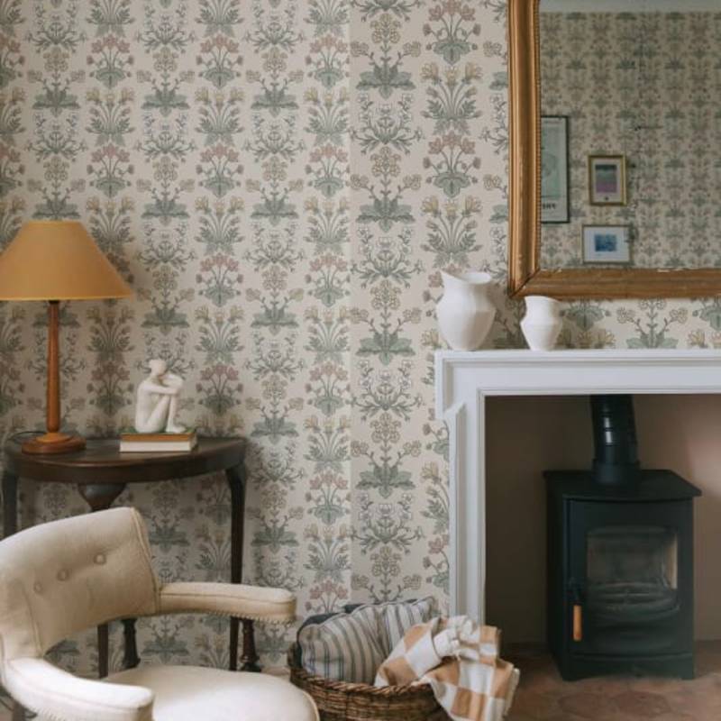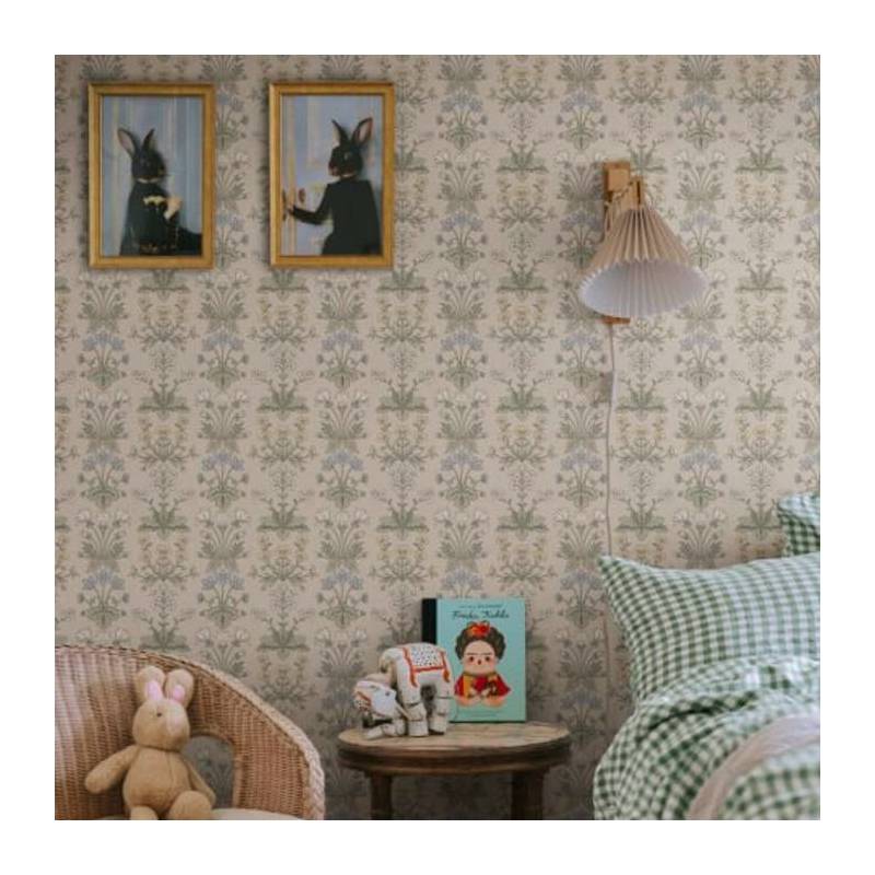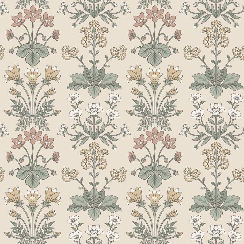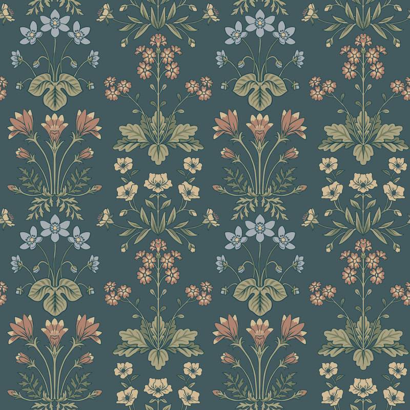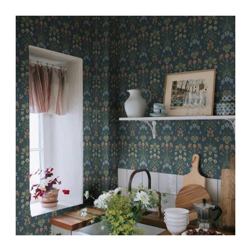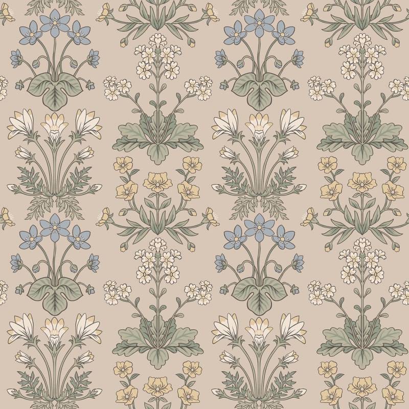 Les charmantes petites plantes bulbeuses qui poussent à l'état sauvage dans l'habitat d'Öland sont les premiers signes du printemps et de l'arrivée de la chaleur. Ce rare papier peint en médaillon comprend la campanule, l'anémone des bois, le tussilage et le rosier soleil. La palette de couleurs, Clay, se compose d'une base de couleur argile, de feuilles vertes et de jolies fleurs bleues, jaunes et blanches.