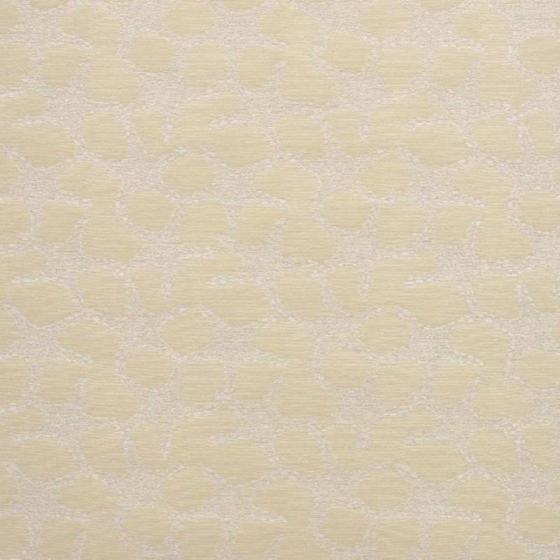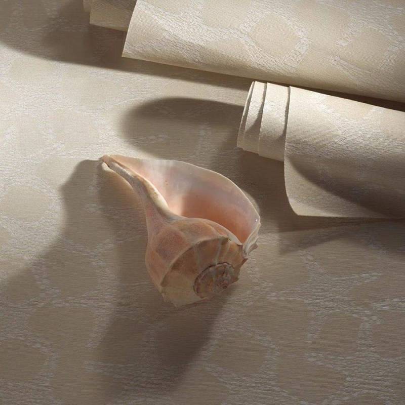 Les jeux de fils de raphia blancs et sable de ce jacquard contrecollé sur intissé donnent vie à ce charmant motif de coquillages.