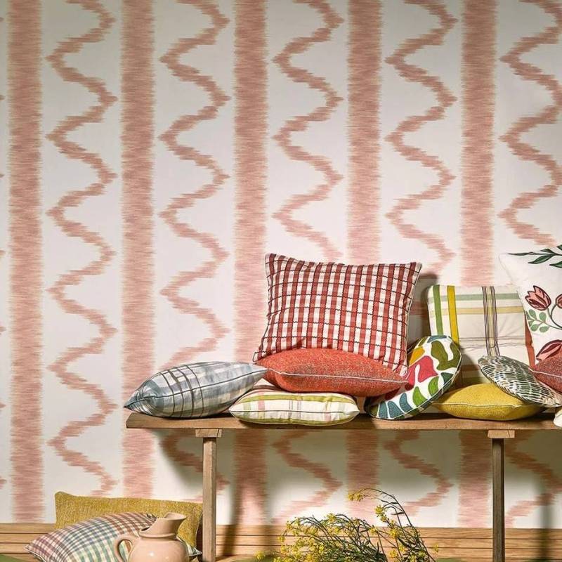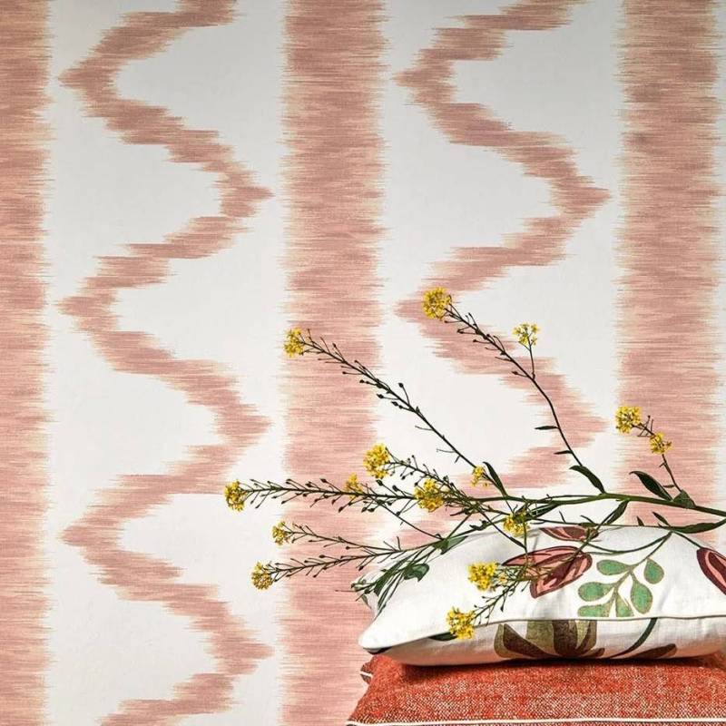 Réinterprétation d’une toile flammée ou ikatée, souvent utilisée en rideau ou en bonnes grâces dans les intérieurs confortables, conservée dans les archives de la Maison. Ce très beau dessin est imprimé ici au cadre plat dans des coloris pastels et lumineux.