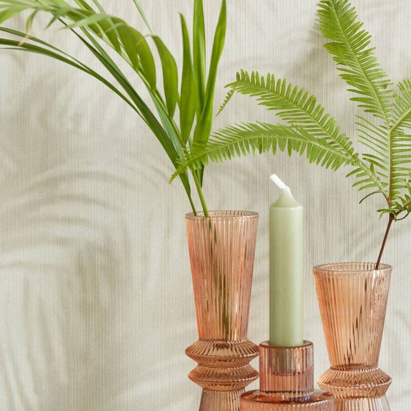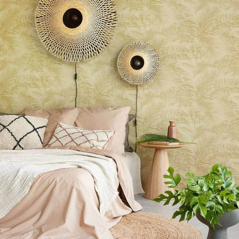 La lumière filtrant à travers le feuillage joue avec l'ombre sur un relief tangible. Une toile de jouy ensoleillée avec des léopards et des tigres déambulant dans le paysage, un vol de grues remplissant le mur et des animaux métalliques étincelants surgissant parmi les palmiers. Un grand motif graphique de palmiers sur un fond à l'effet textile subtil, un motif en éventail inspiré de la feuille de ginkgo.
