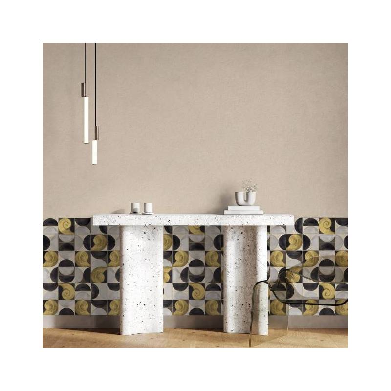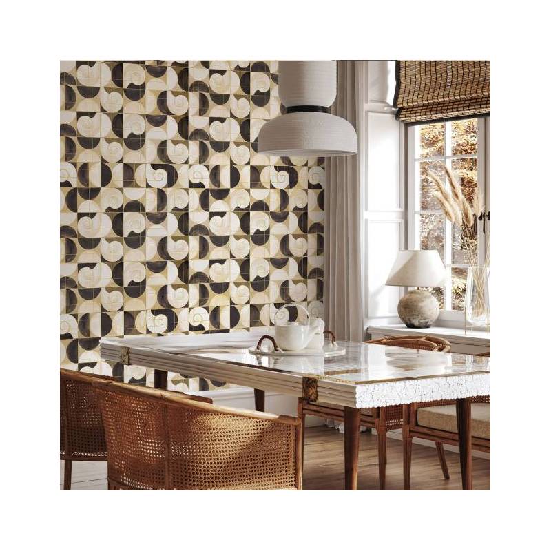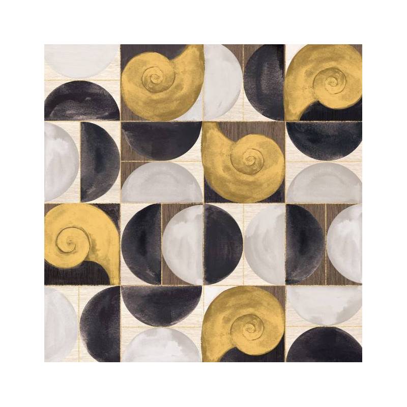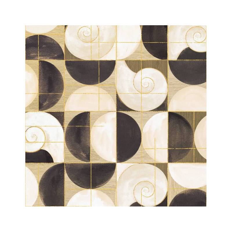 Toute l’élégance et le raffinement de l’Art Déco sont réunis dans le somptueux motif du décor mural Ammonis Or. Les ammonis, ces fossiles d’ammonites, des mollusques ayant disparu il y a 65 millions d’années, dévoilent une splendide coquille à spirale qui rappelle les cornes de bélier. L’assemblage de ce motif aux courbes très douces dévoile un jeu de géométrie et de couleurs portées par le beige, le bois clair de la marqueterie et le marron. Les reflets métalliques dorés du papier apparaissent sur les rainures du bois et sur les traits de dessin qui viennent structurer les coquillages, comme pour souligner la rigueur géométrique d’un motif à raccord. Les coquillages peints à la main dans un beige à l’effet nacré, n’en semblent que plus précieux.
