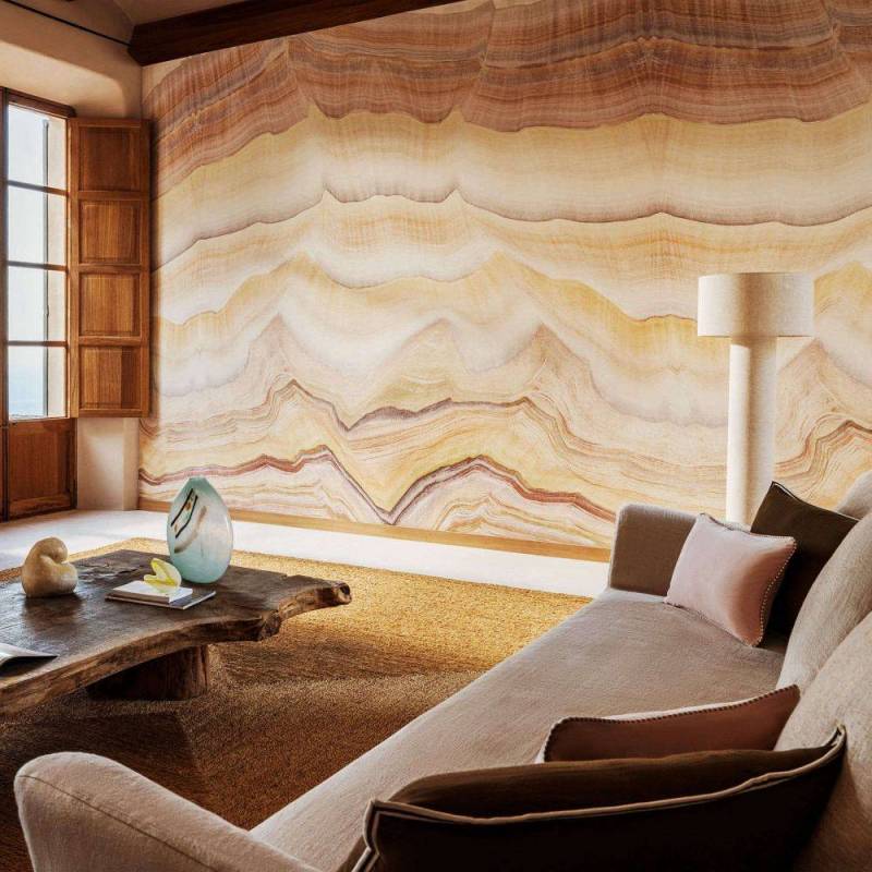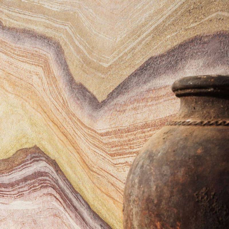 Papier peint panoramique aux lignes graphiques inspirées de formations naturelles, créant un jeu de relief et de mouvement sur le mur. Son rendu structuré apporte une touche moderne et élégante.