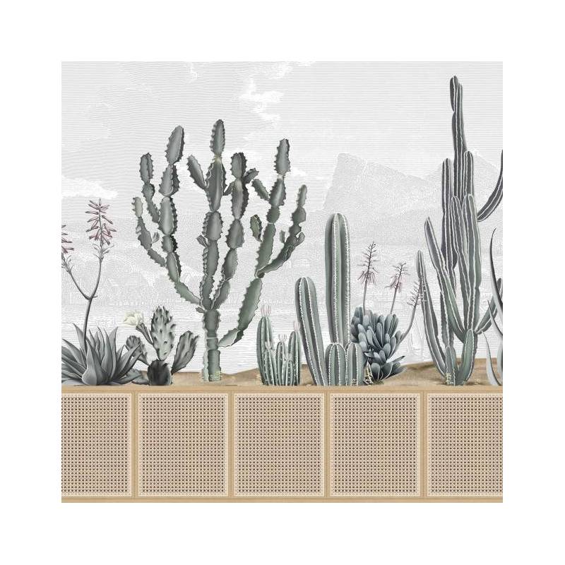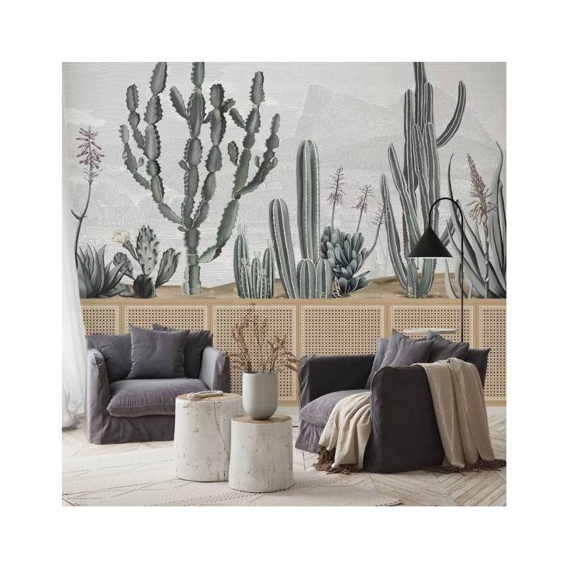 Décor panoramique intissé sur mesure représentant des cactus verts avec une gravure grise en fond. Nous vous conseillons d'ajouter 5 cm à votre hauteur et votre largeur.