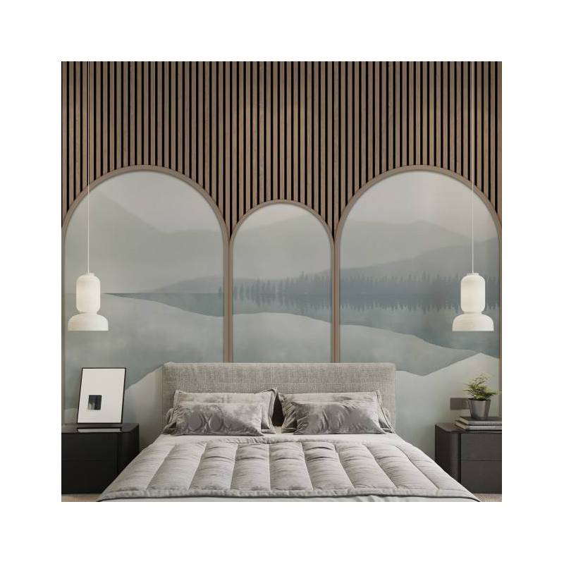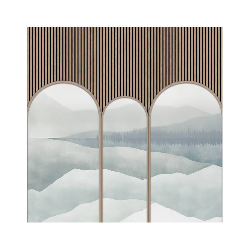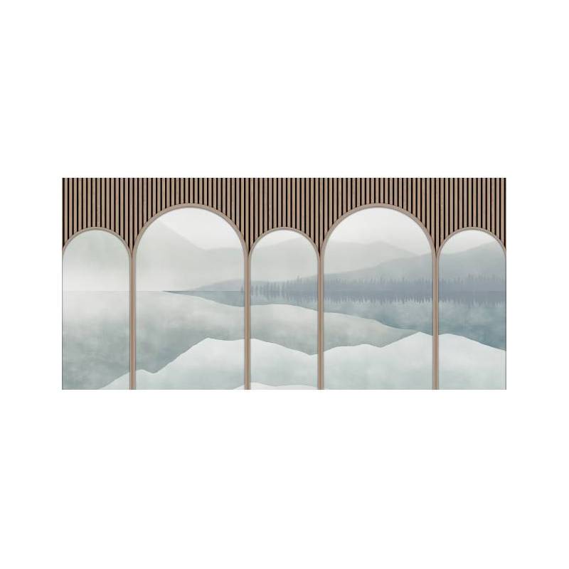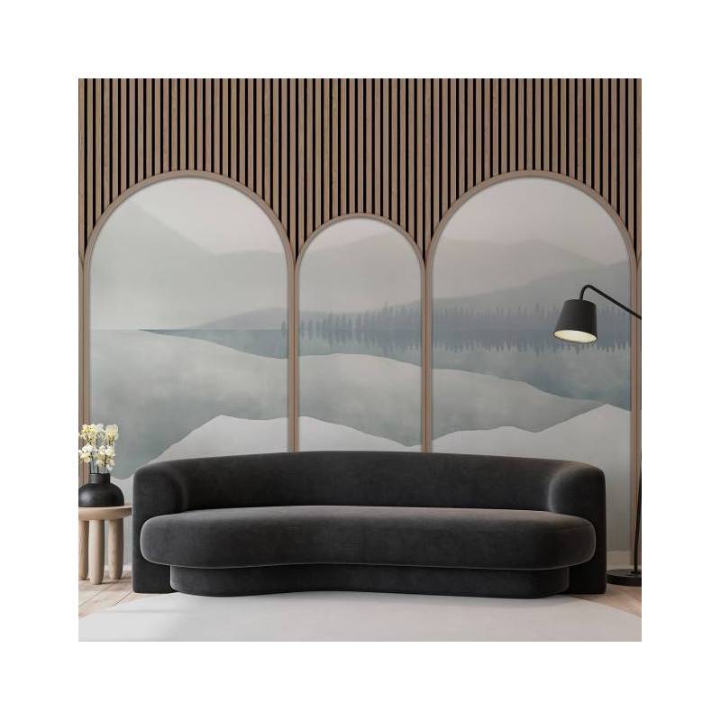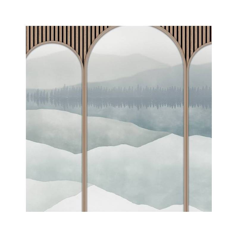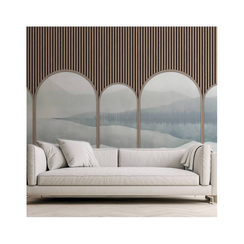 Le décor panoramique sur mesure Astrée est un trompe-l’œil qui se compose de cinq arches surplombées par des tasseaux de bois clair. Telles des scénettes, les arches dévoilent tour à tour la fresque panoramique Green Lake, ici colorisée dans des nuances de bleu apaisantes, qui contrastent tout en douceur avec la couleur du pin. Ce décor mural saisissant donne une impression de profondeur spectaculaire.