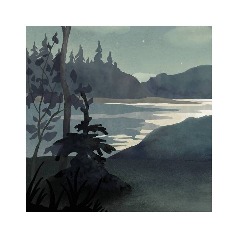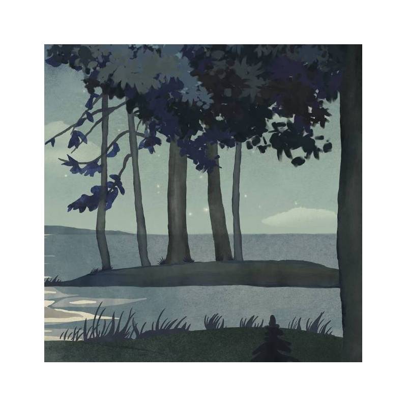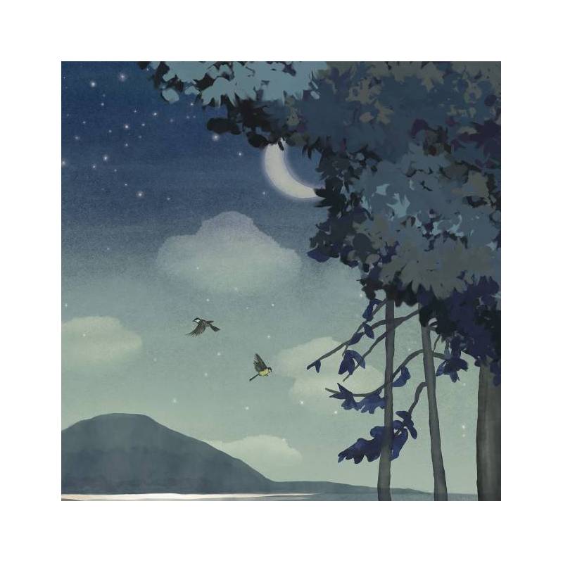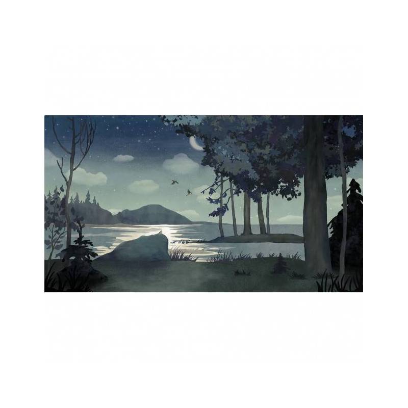 La nuit est calme et tranquille. Dans le décor panoramique sur mesure Au clair de lune, tout est immobile : l’eau du lac, les nuages, l’herbe et les feuilles des arbres. Seuls deux oiseaux volent vers de nouveaux horizons, éclairés, révélés par la lune dont la lumière donne corps à tous les éléments de cette carte postale nocturne. Le superbe reflet dans le lac dessine un chemin vers la montagne du fond. Ce papier peint panoramique apaisant, porté par le bleu et un jeu de clair-obscur, invite définitivement au rêve.