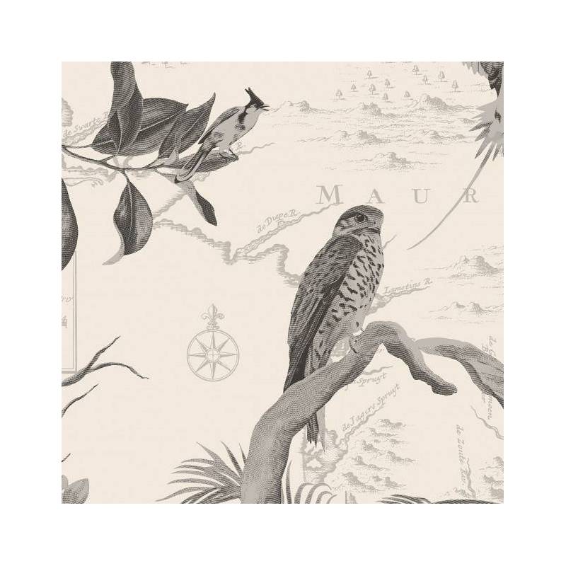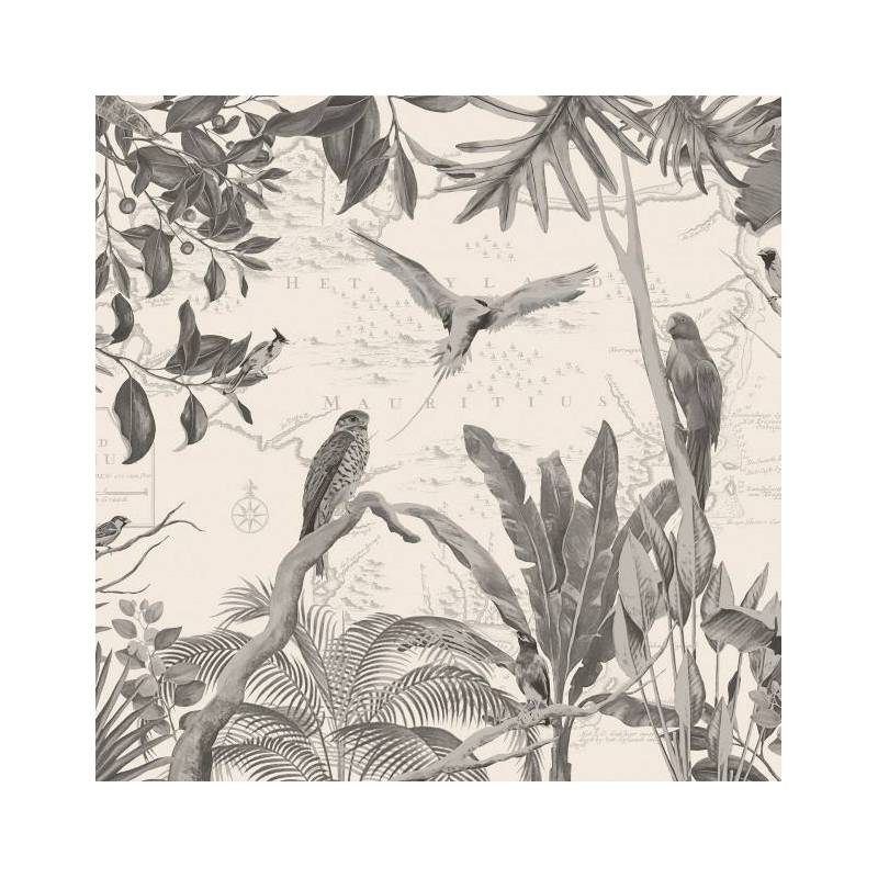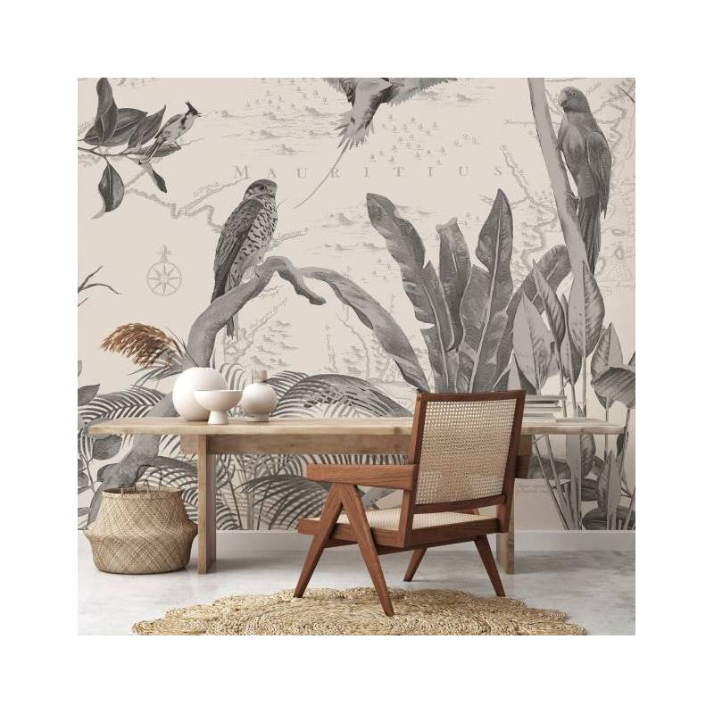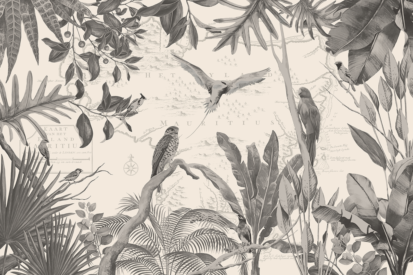 Au premier plan, des espèces d’oiseaux endémiques de l’île ont été dessinées à la main puis travaillées sous forme de gravure : la Crécerelle de Maurice, la Grosse Cateau Verte, plus connue sous le nom de Perruche de Maurice, le Paille-en-Queue, ou encore des merles. Telle un cadre, la végétation tropicale apporte de la profondeur au décor, l’un des oiseaux semble la traverser pour survoler l’île.