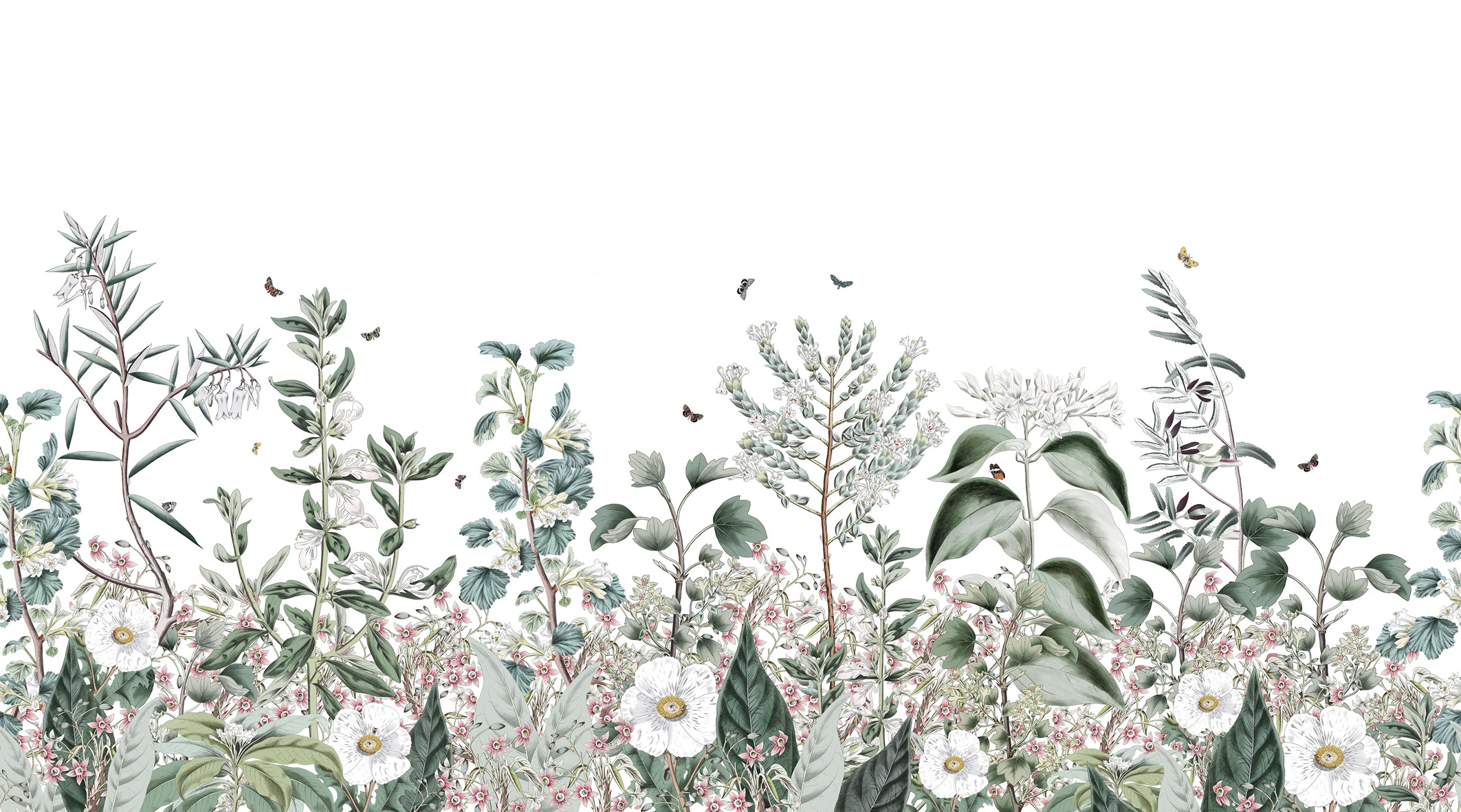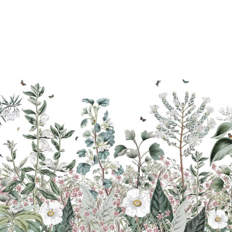Papier peint panoramique intissé fleuri et végétal qui s'inspire d'aquarelles botaniques. Décor mural disponible sur-mesure. Nous vous conseillons d'ajouter 5 cm à vos dimensions sur la largeur et la hauteur de votre décor.