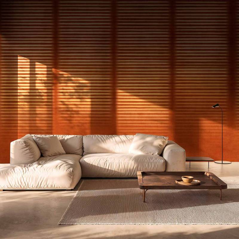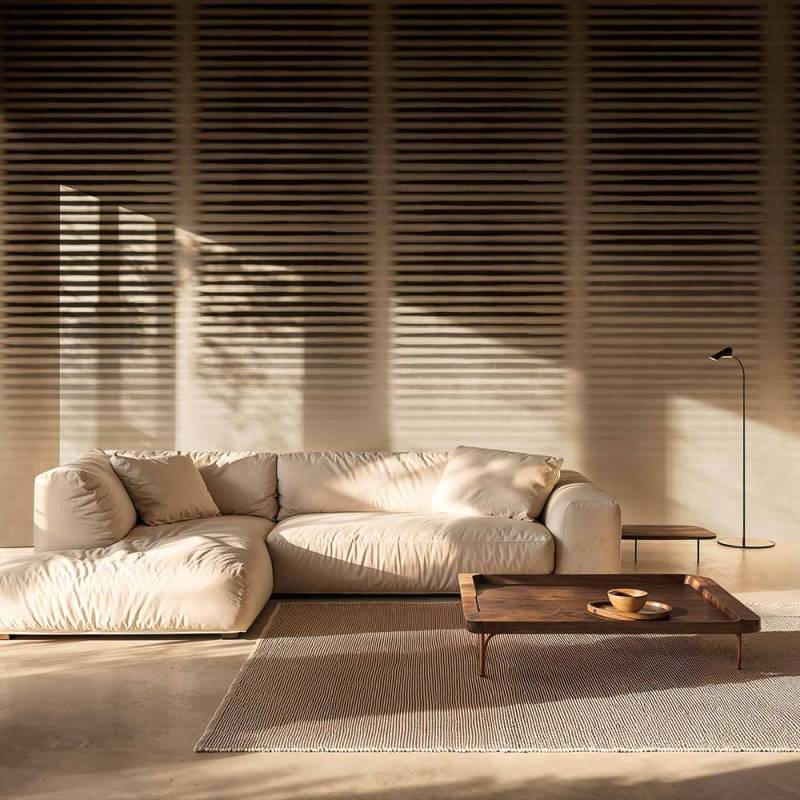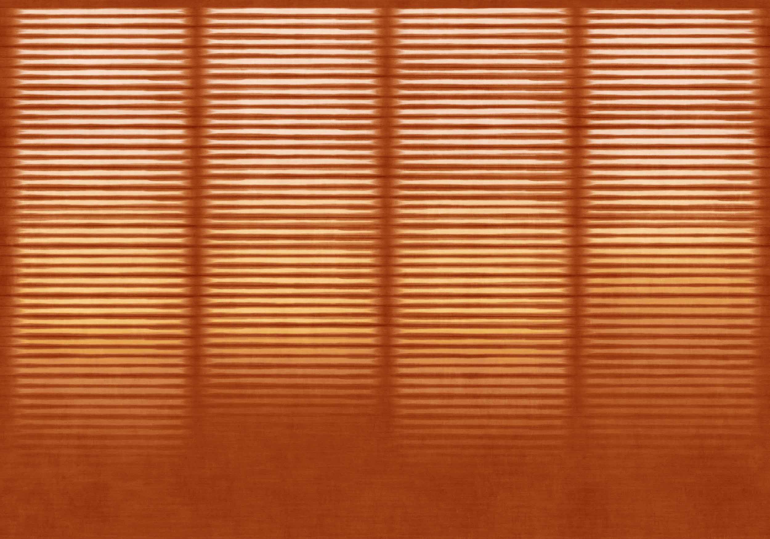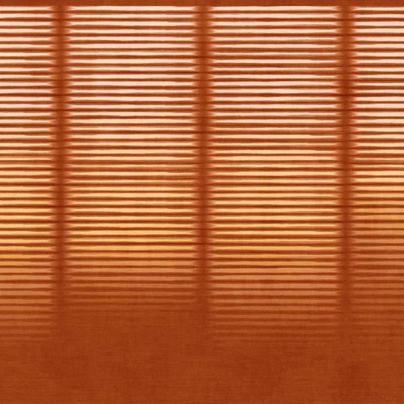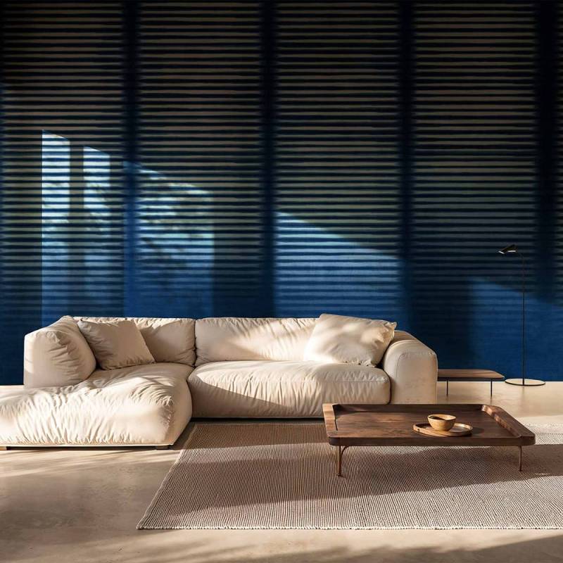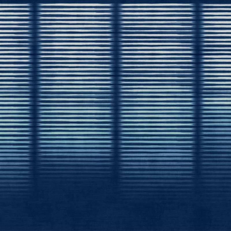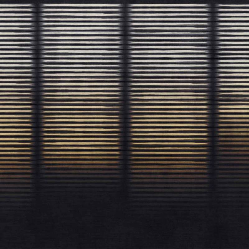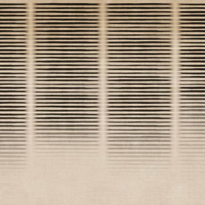 Le décor transpose la lumière dans un jeu de lignes horizontales régulières, suggérant un rideau immobile où le silence semble s’installer. Avec une grande maîtrise, les rayures imposent un rythme lent et une profondeur mesurée, créant une ambiance enveloppante et contemporaine.