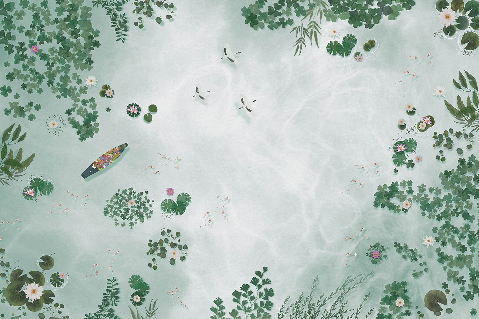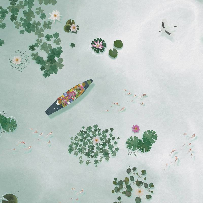 Dans un coin du lac, une barque décorée de fleurs aux couleurs vives semble attendre qu’un couple d’amoureux embarque pour une promenade romantique. Dans le ciel, des grues du Japon savourent le spectacle floral, alors que les poissons nagent sous l’eau à la recherche de nourriture. Chuuut, entendez-vous le croassement des grenouilles ?!