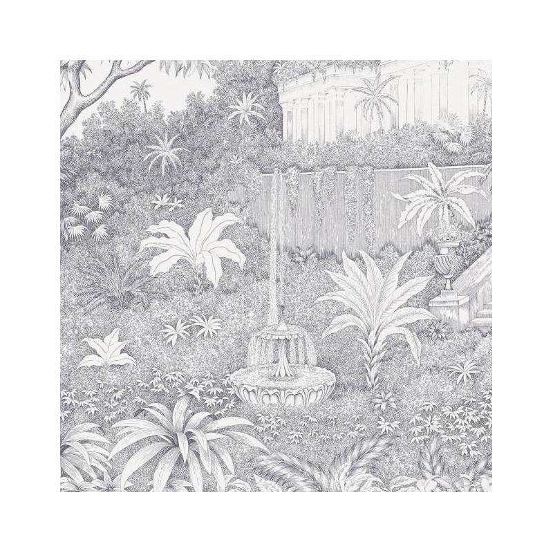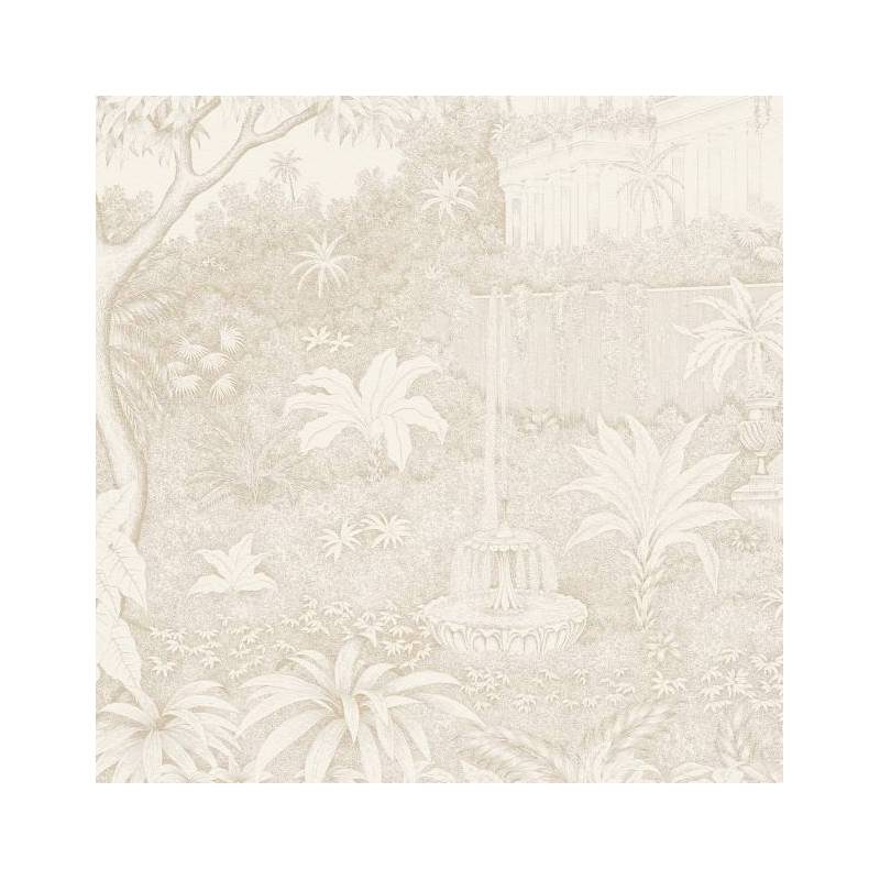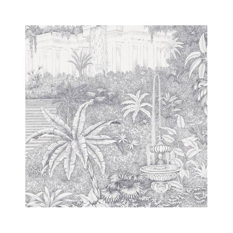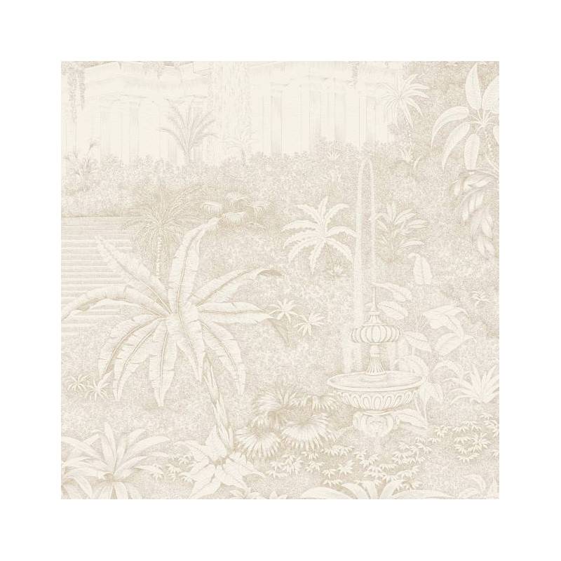 Chaque détail de ce papier peint panoramique sur mesure - des arches délicatement ciselées aux terrasses surélevées - évoque l'opulence et la grandeur de cette époque révolue. L’architecture imposante se mêle harmonieusement à la nature luxuriante composée de palmiers et autres plantes tropicales, de feuillages étoffés et de massifs floraux.