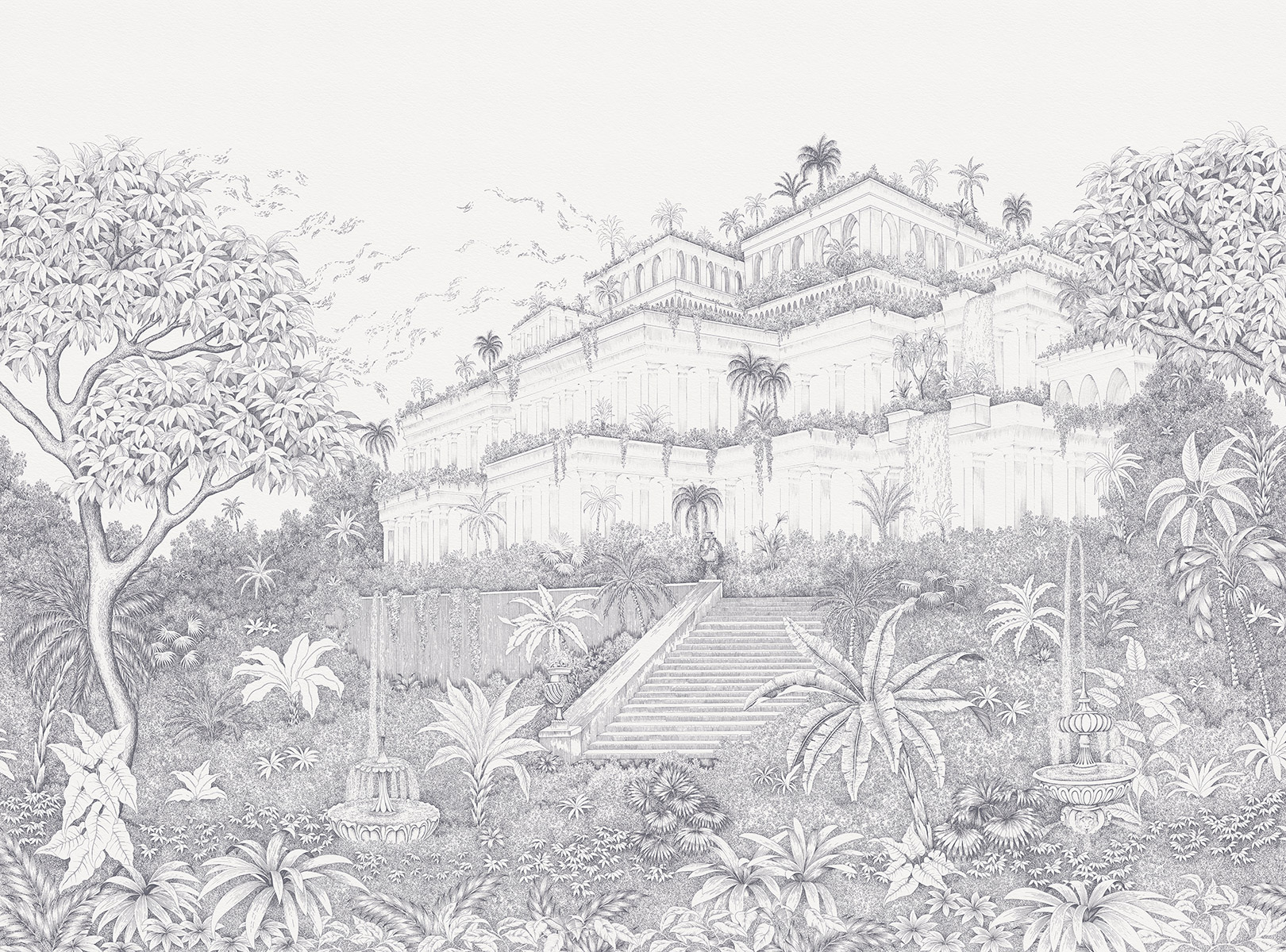 Inspiré des mythiques Jardins de Babylone, l’une des sept merveilles du monde, le décor panoramique sur mesure Jardin suspendu est une fenêtre ouverte sur l’Antiquité.
