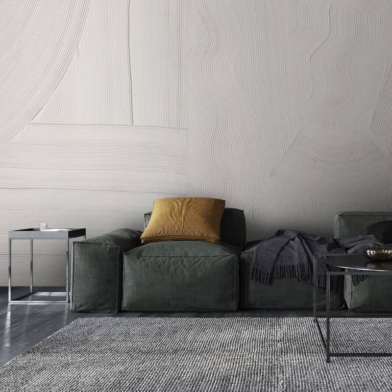 Le décor panoramique Lines echoes met à l’honneur le plâtre à l’état brut.