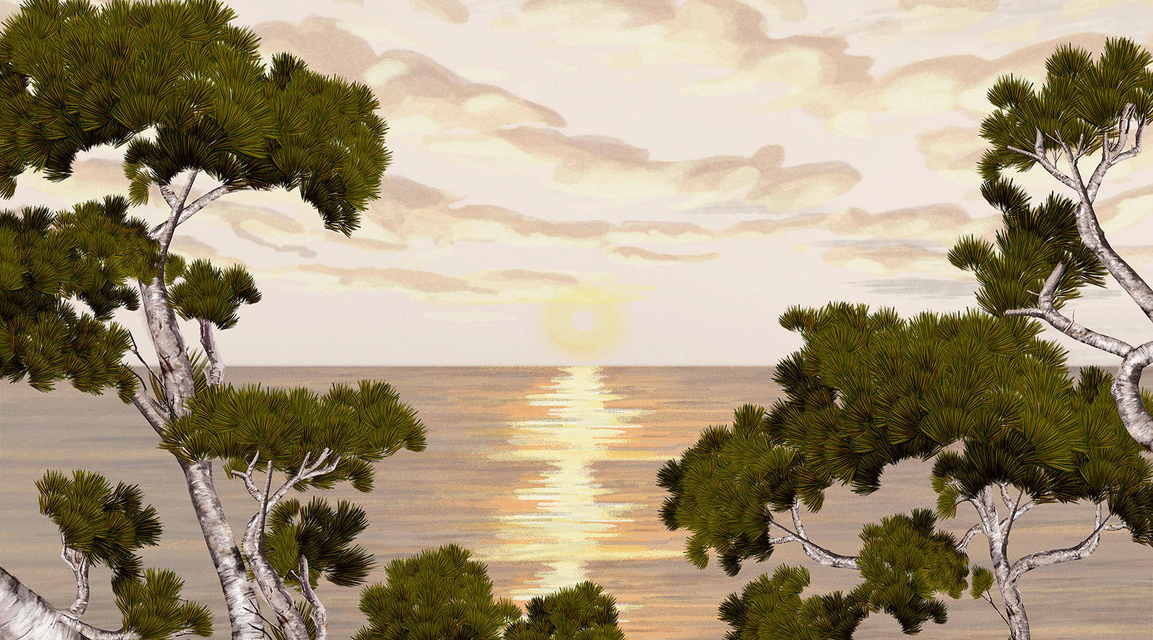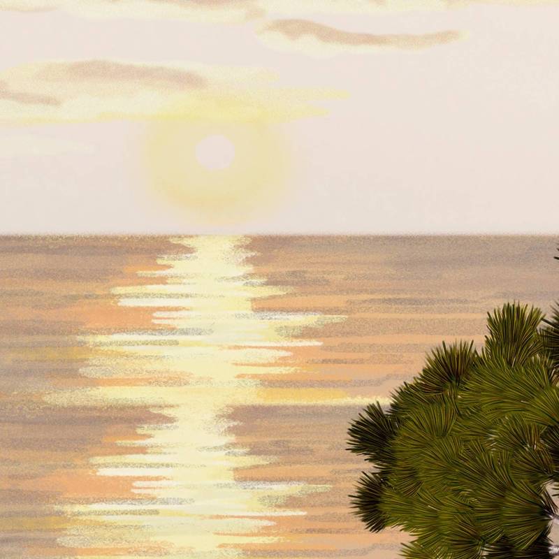 Un coucher de soleil impressionniste illumine le mur. Les pins se détachent sur un ciel flamboyant, tandis que l'océan scintille.