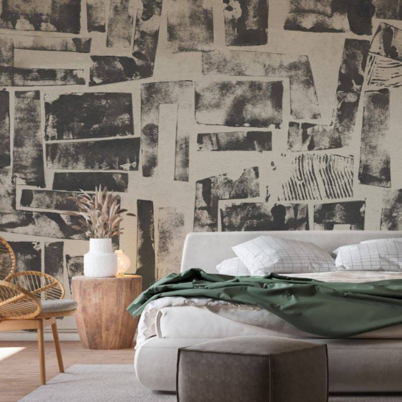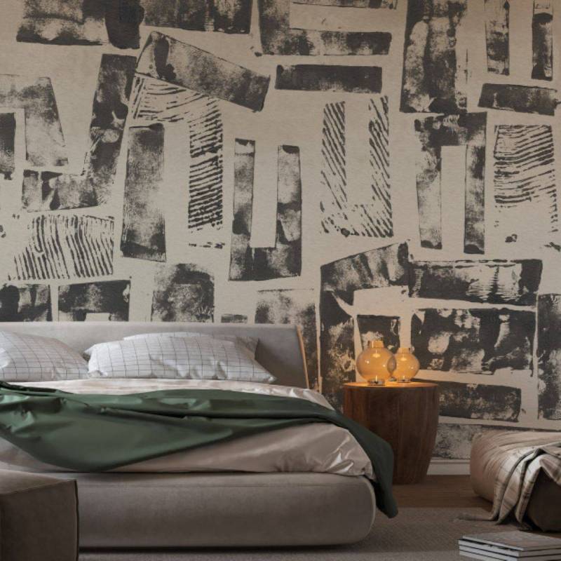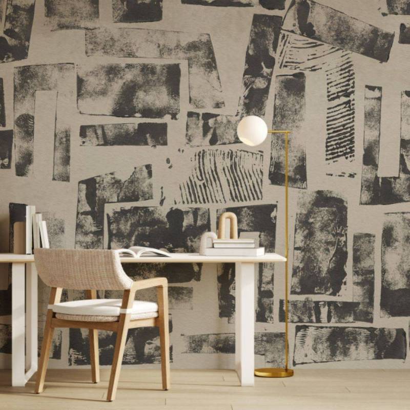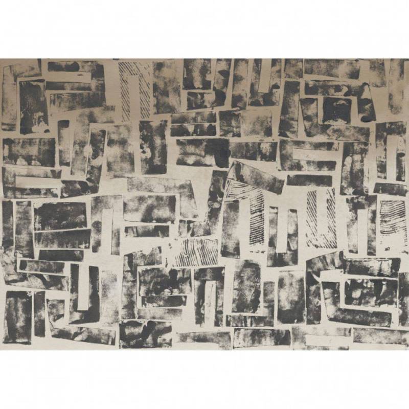 Le décor panoramique sur mesure Mix stamp est un assemblage de formes réalisées à partir de tampons, eux-mêmes fabriqués avec des feuilles de cartons enduites d’encre.