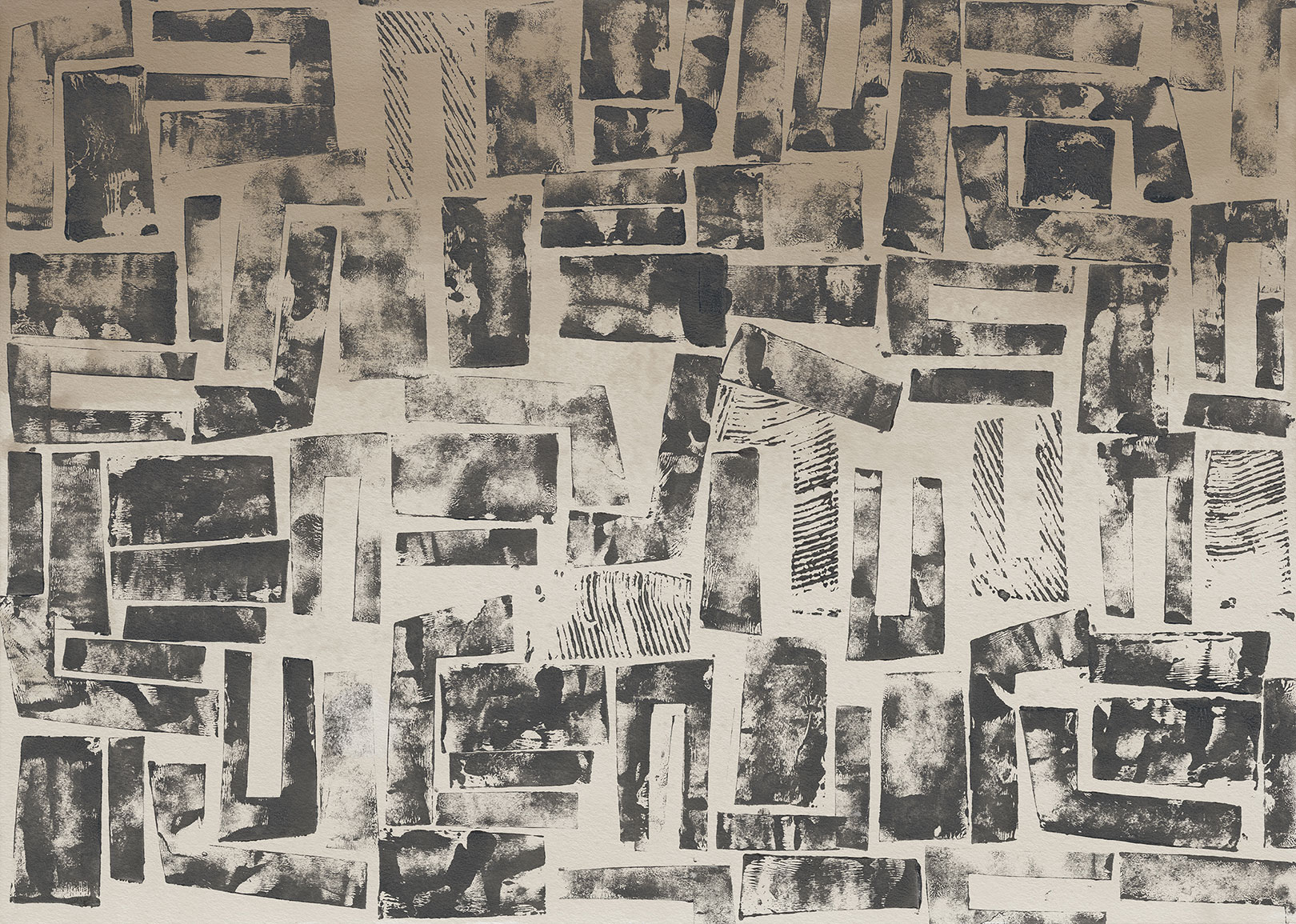 Les rectangles, tamponnés de manière aléatoire, créent ainsi des formes graphiques et un mouvement sur le décor.