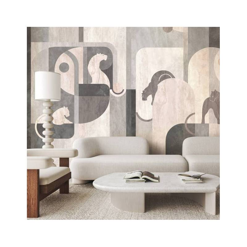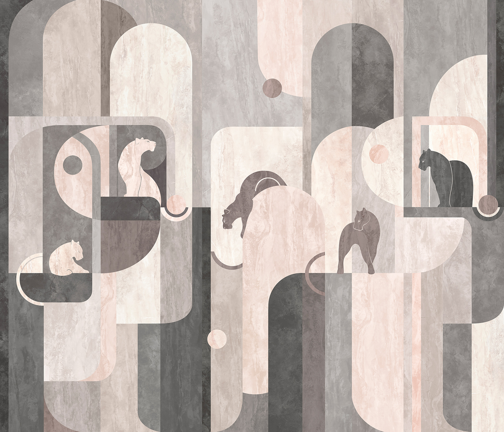 Entièrement dessiné à la main, ce décor mêle harmonieusement des éléments iconiques de l’Art Déco: les panthères, les arches et le fond marbré. Un subtil jeu de formes et de contre formes se déploie dans un camaïeu de beiges et de roses et apporte mouvement et rythme au ballet félin.