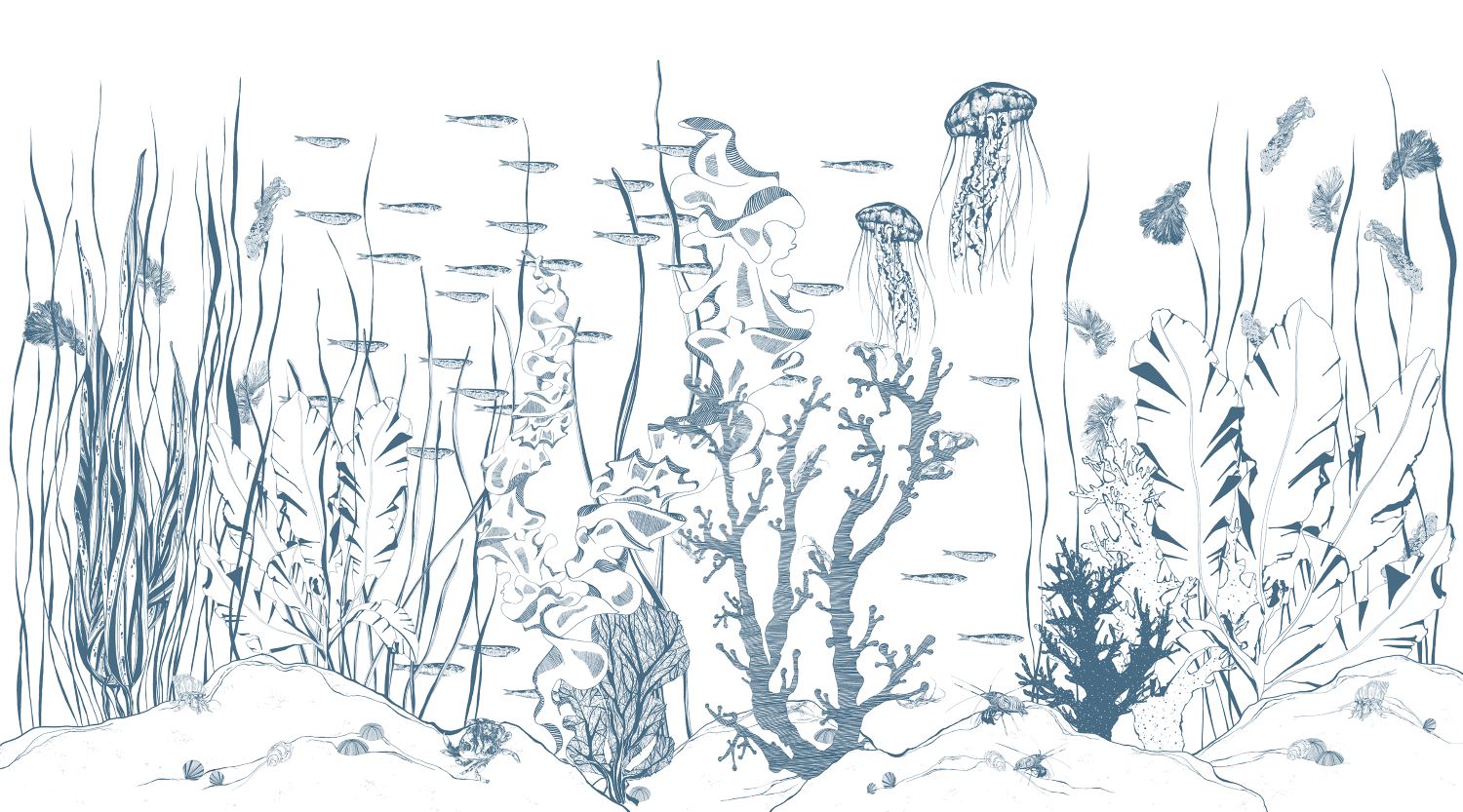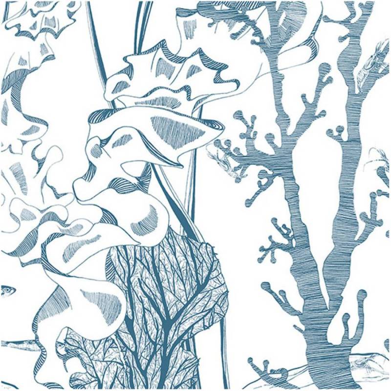 Underwater est un sublime dessin représentant les fonds marins, avec de délicates algues et des animaux de la mer, du crabe aux méduses en passant par les petits poissons ou le bernard-l’hermite. Les détails de ce monde aquatique sont fins et raffinés, simples et abstraits, et font toute la beauté de ce décor très poétique.