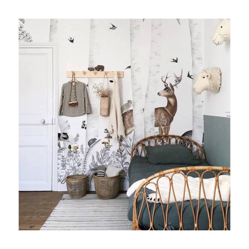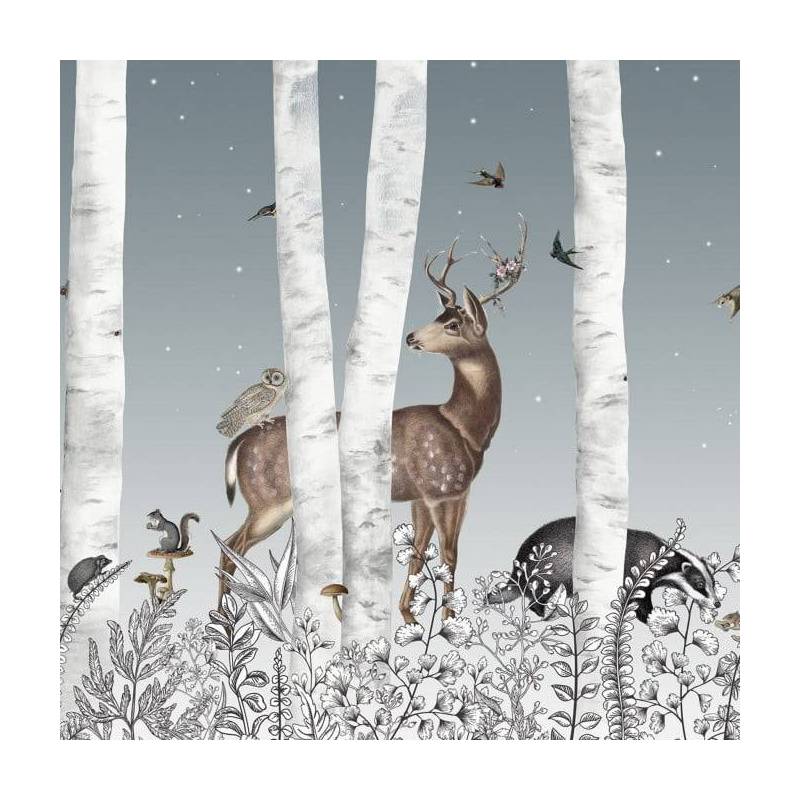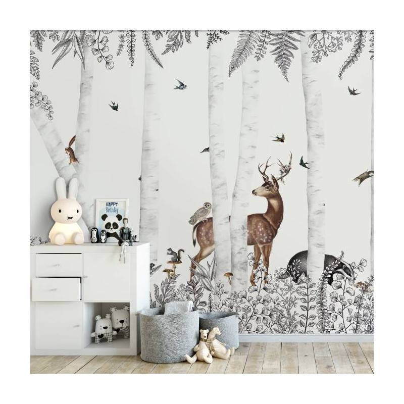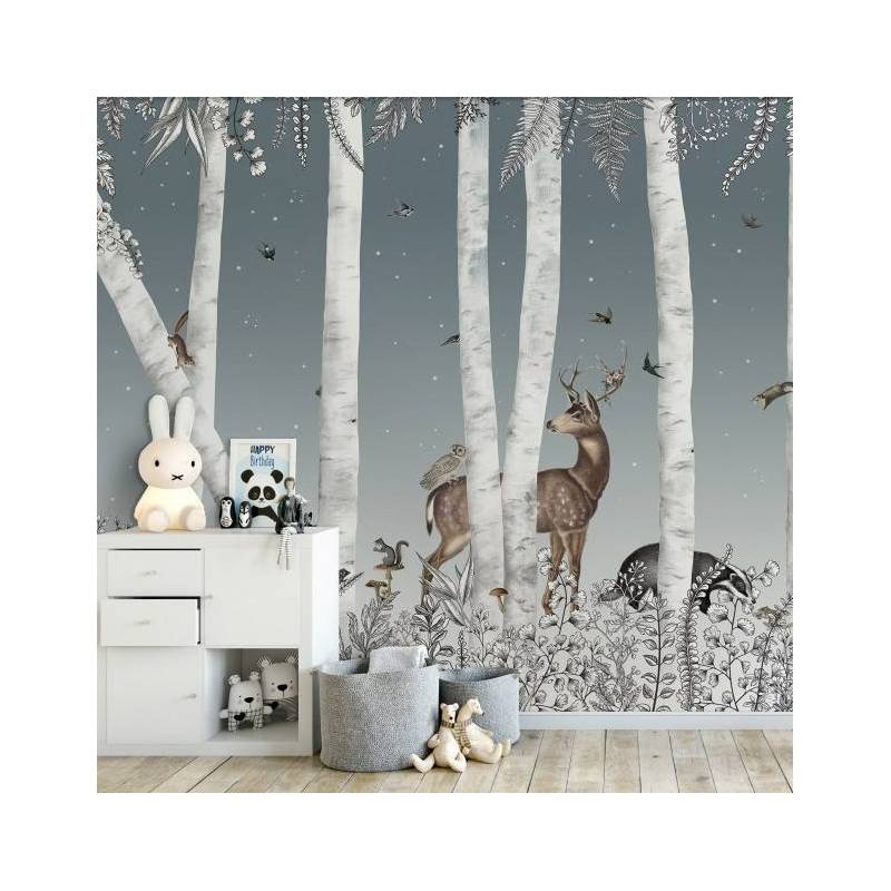 Une magnifique forêt enchantée avec un cerf et un chevreuil, un écureil et d'autres animaux forment le décor Woody Chesnut, qui sera parfait pour une chambre d'enfant poétique. Ce papier peint est personnalisable et est disponible en version jour avec un fond blanc.