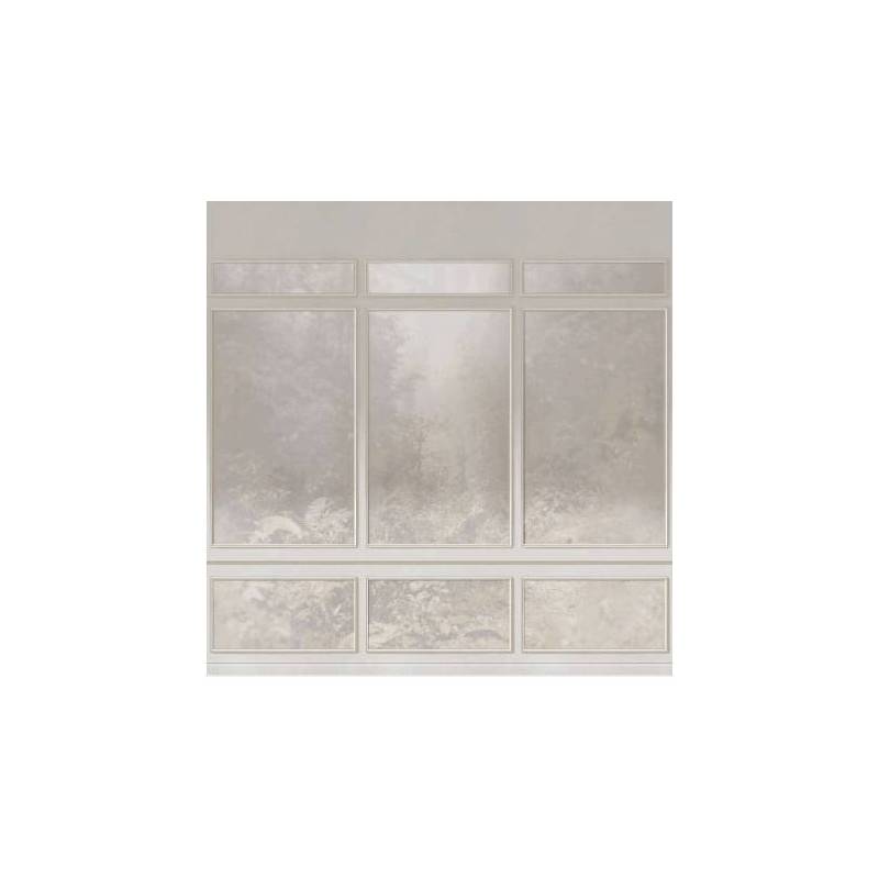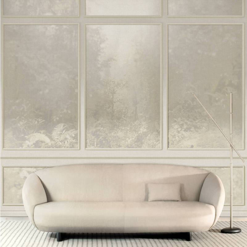 Le charme de Paris résonne dans le revêtement mural Vendôme, composé d’une série de panneaux créant un effet de boiserie. Le paysage, encadré par des profils géométriques, met en scène un trompe-l’œil représentant une forêt d’arbres caducs. Ce dessin reprend celui du revêtement mural Iolanta, issu de la collection Armani/Casa Precious Fibers 2.