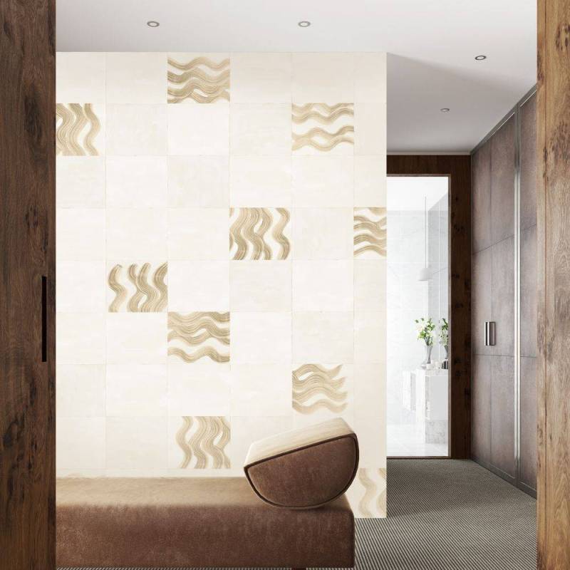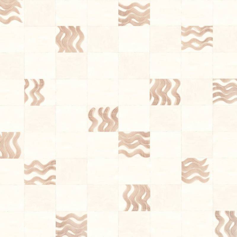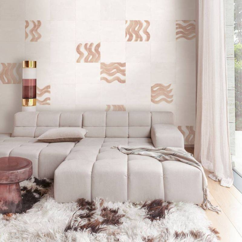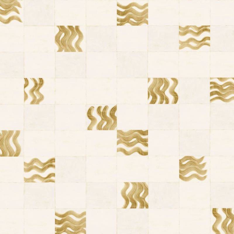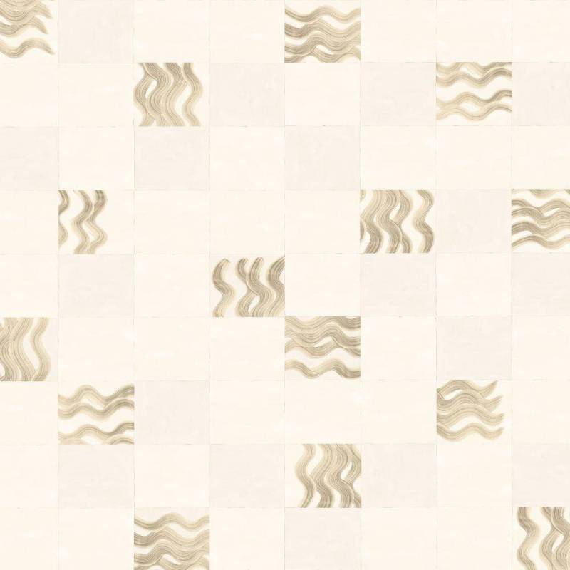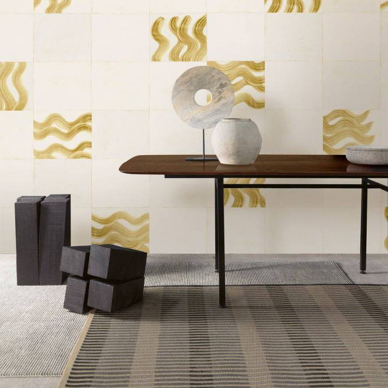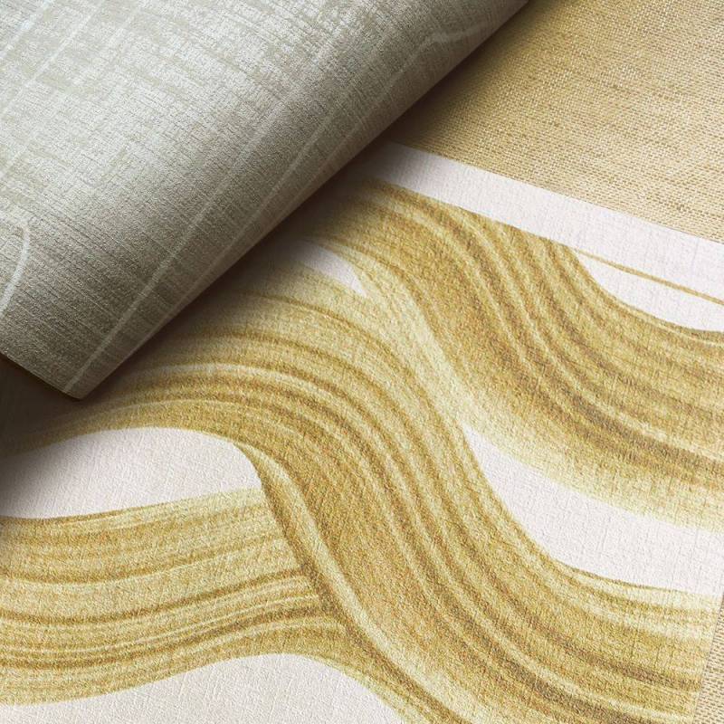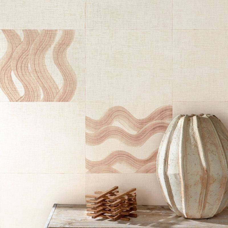 Ce papier peint panoramique est caractérisé par une base intissée à structure de lin, ornée d'un motif géométrique irrégulier inspiré de vagues et subtilement rehaussé d'une brillance perlée.