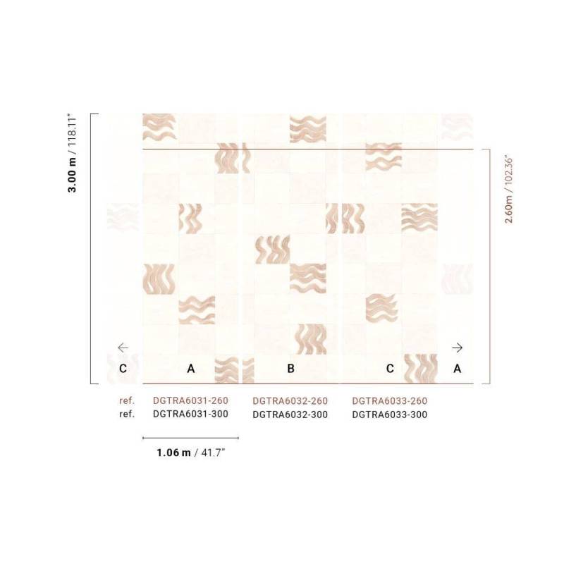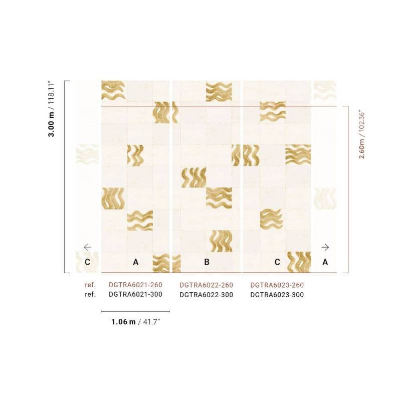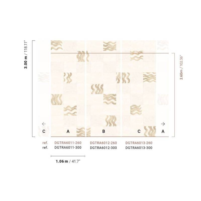 Papier peint Panoramique Yugen de la collection Traces de chez Masureel. Ce modèle est composé de trois lés (A, B et C) distincts, vendus séparément au prix indiqué, et disponibles en deux tailles.