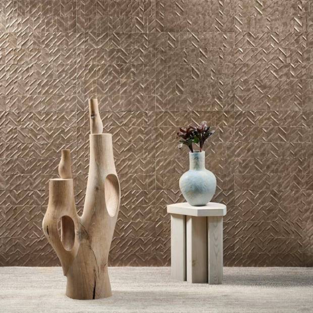 Papier peint Perula de chez Arte, collection Luster. Vendu par colisage de 4 plaques. Une plaque = L 0,50 m x H 0,50 m.