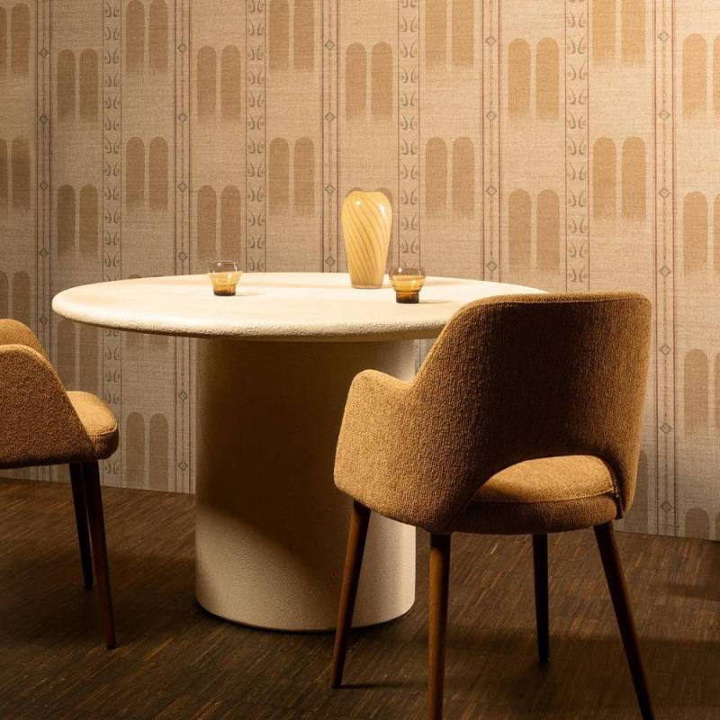 Ce motif vaporeux porte le nom de la ville indienne de Pune, autrefois appelée Poona, où se situe le splendide palais Aga Khan. Imprimé sur une base en vinyle à l’apparence de lin tissé d’un grand réalisme, le motif s’inspire des majestueux arcs emblématiques de ce joyau architectural.