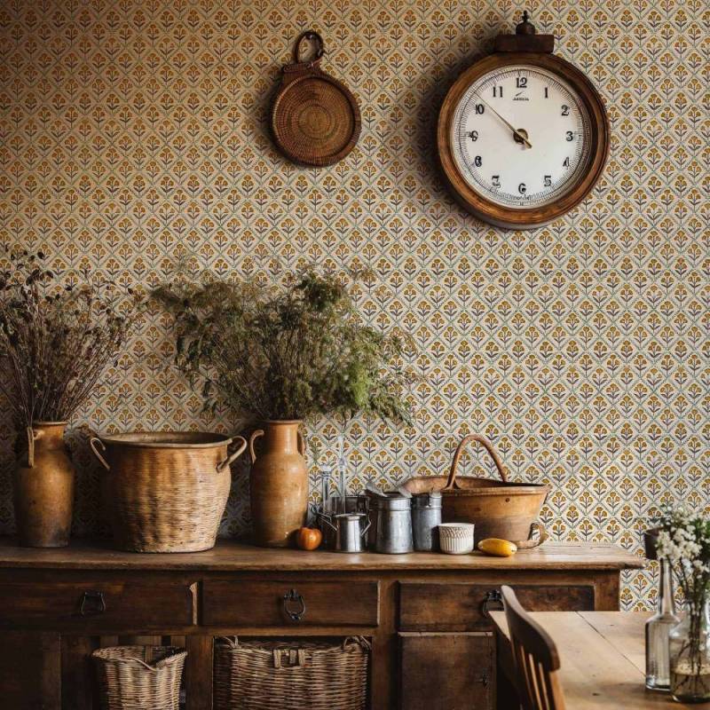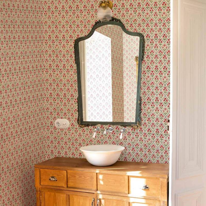 Papier peint au nom évocateur de la maison Coordonné, Coquelicot embellit l’espace avec une note de romantisme. Ses fleurs s’épanouissent avec grâce entre les mailles d’un treillis de branchettes. La palette chromatique qui complète cette pièce enrichit le décor d’une sophistication exquise.