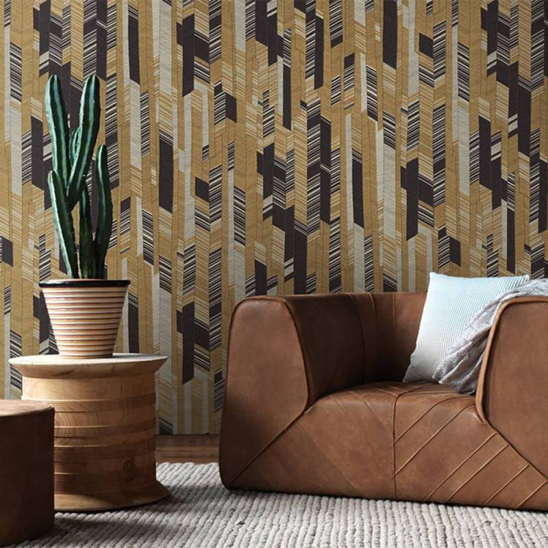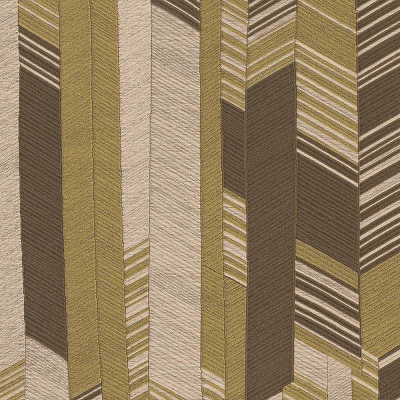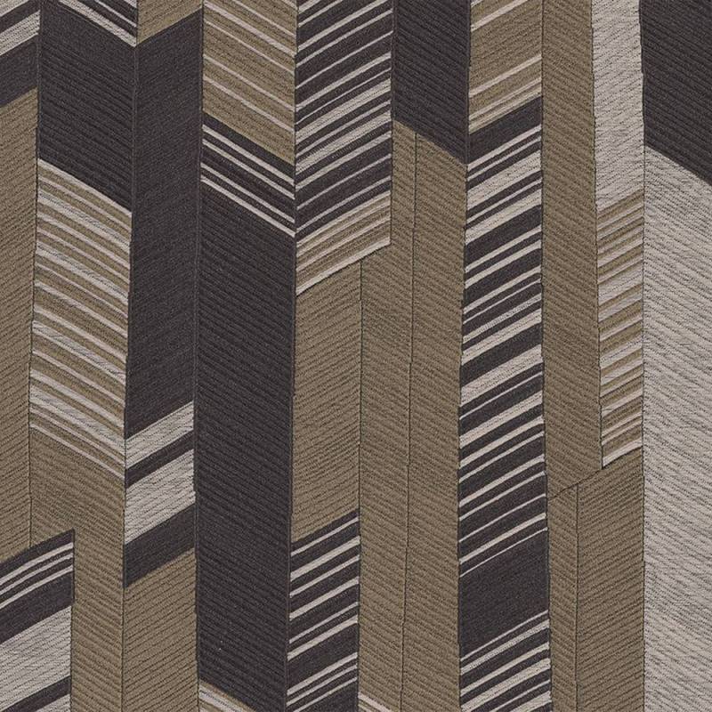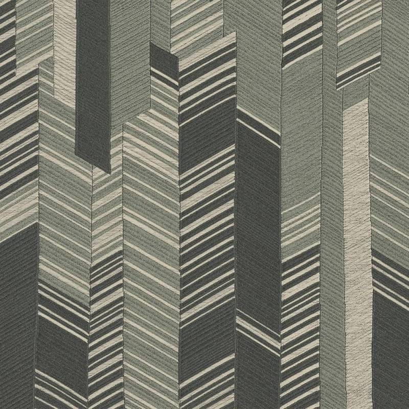 Un jeu sophistiqué de tissus et de géométries, où le motif chevron est déconstruit et réinterprété en versions multicolores et ton sur ton. Imprimé et gaufré en repérage, le design présente un effet textile allant d’une interprétation vive et dynamique à une version plus sobre et homogène.