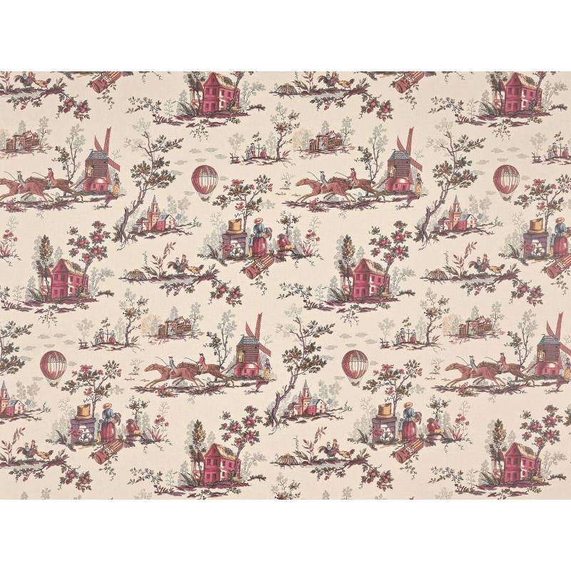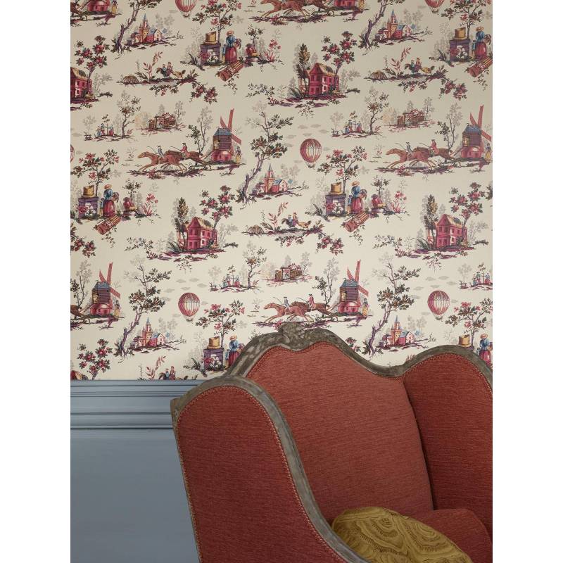 Ce papier reproduit une toile de Jouy, imprimée à la planche de bois par la Manufacture Royale d’Oberkampf vers 1785, présentant des scènes bucoliques. Sa datation est attestée par la présence d’un ballon dirigeable, dont le tout premier vol fut fait au départ de Paris en 1783. Le document conservé dans le fonds patrimonial de la Maison est une courtepointe, probablement utilisée dans un lit à duchesse. On ne peut qu’imaginer les rêves de voyages fantasmés au moment de s’endormir. Impression numérique sur un intissé de grande qualité. Coordonné au tissu SCENES DE CAMPAGNE B7692.