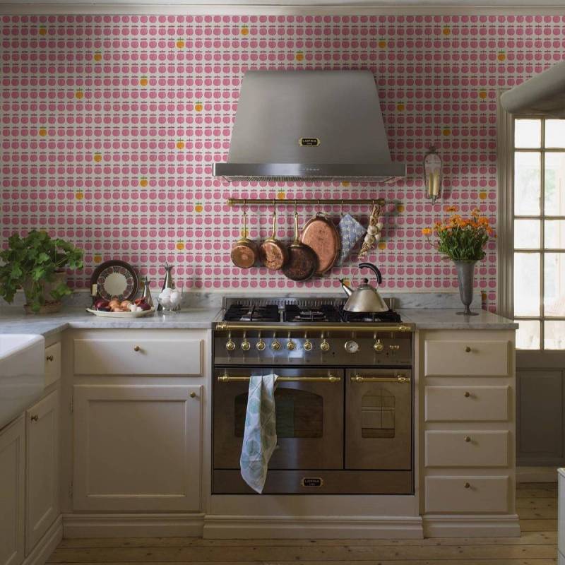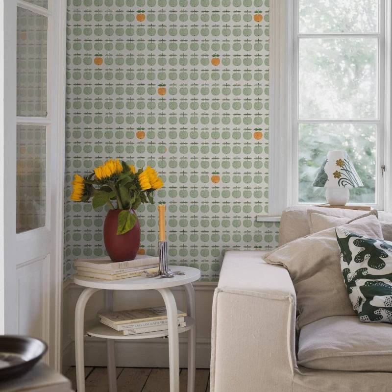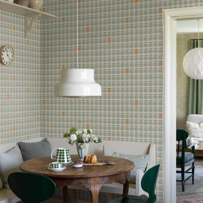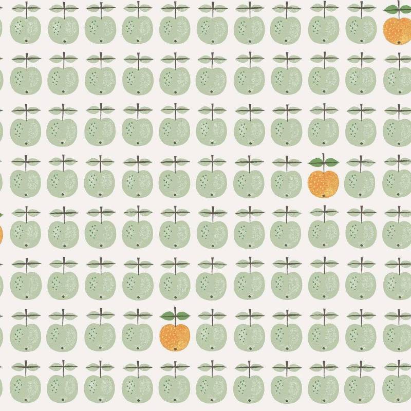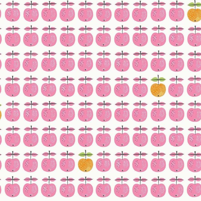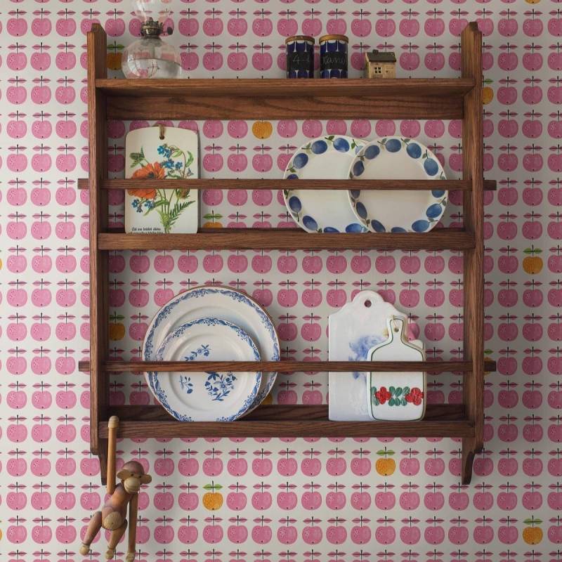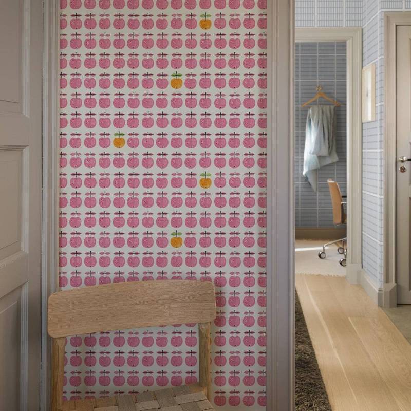 Le motif issu de la célèbre série de porcelaine des années 1960 de Stig Lindberg orne désormais notre papier peint Pall. Sur un fond blanc éclatant, des pommes stylisées et ludiques en rose cerise s’alignent en rangées régulières, tandis qu’une pomme jaune orangé occasionnelle apporte un contraste vivant.