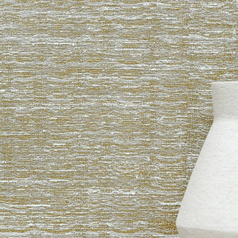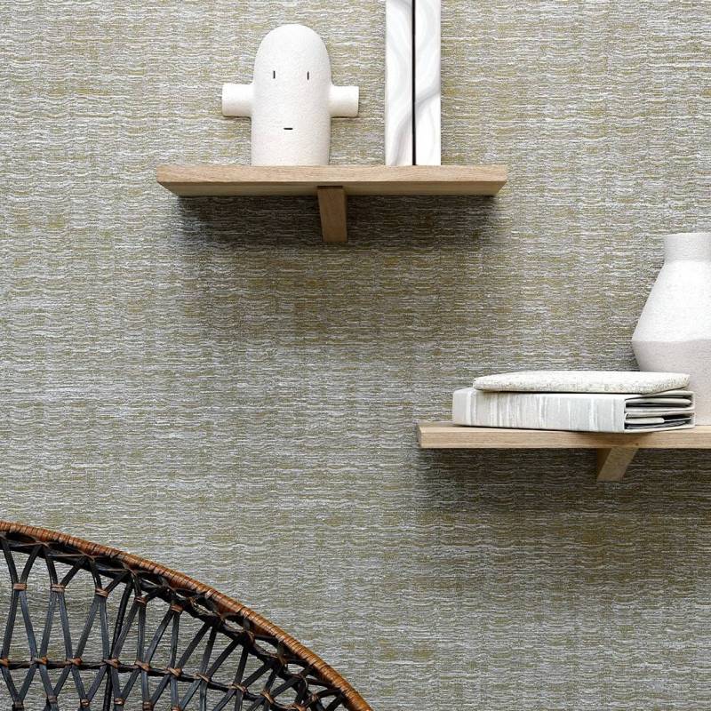La surface de ce revêtement mural est animée d'ondes successives liées au tissage en alternance de fils mats et brillants comme posés en surface. Les variantes se déclinent en contraste dans une palette de fils métallisés et de fibres naturelles.
